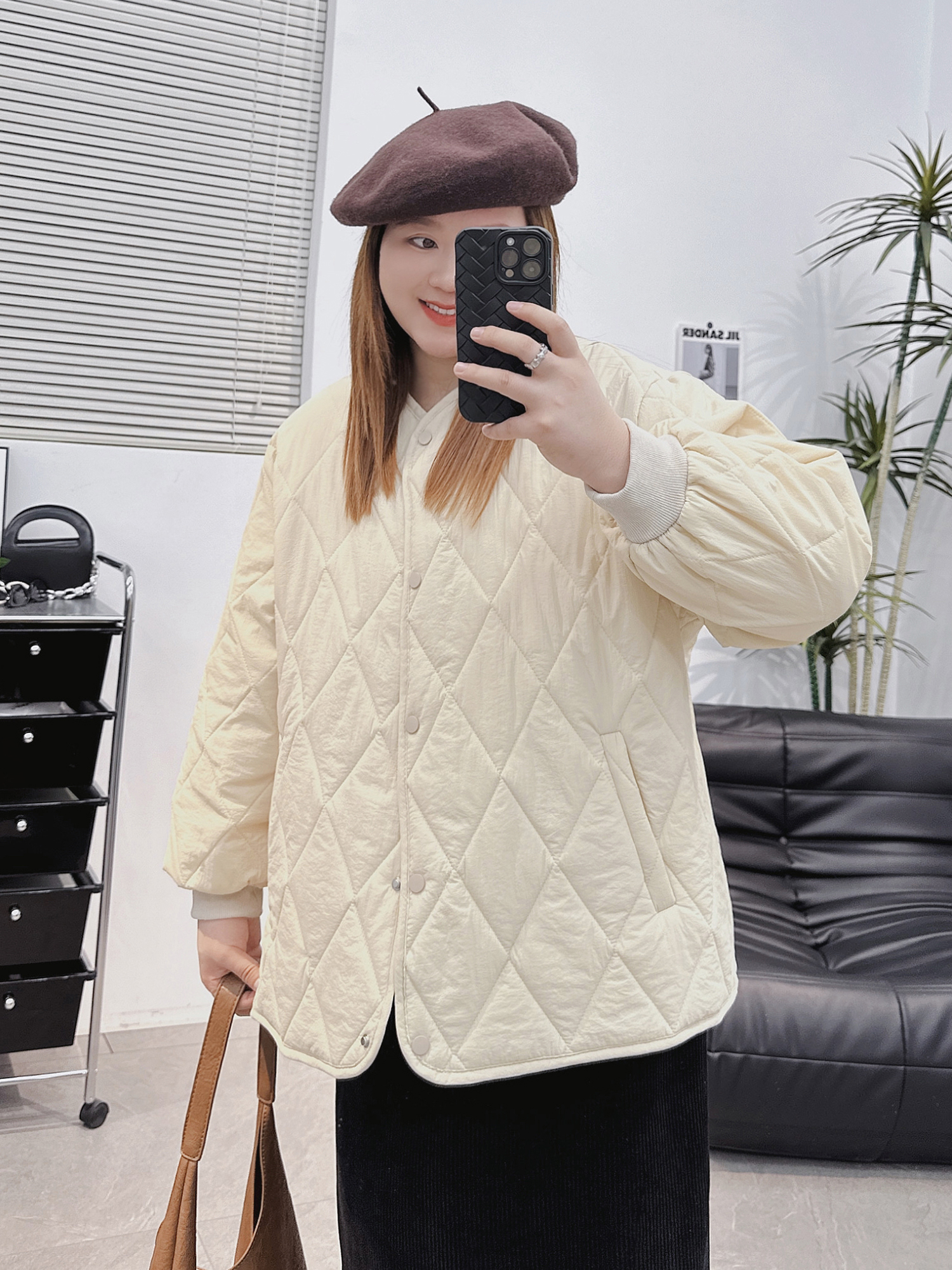 宛宛大码秋冬季韩版轻薄外套女胖mm菱格圆领休闲无领保暖棉衣棉服