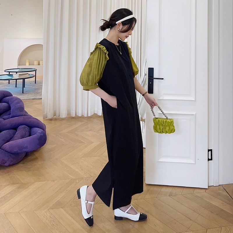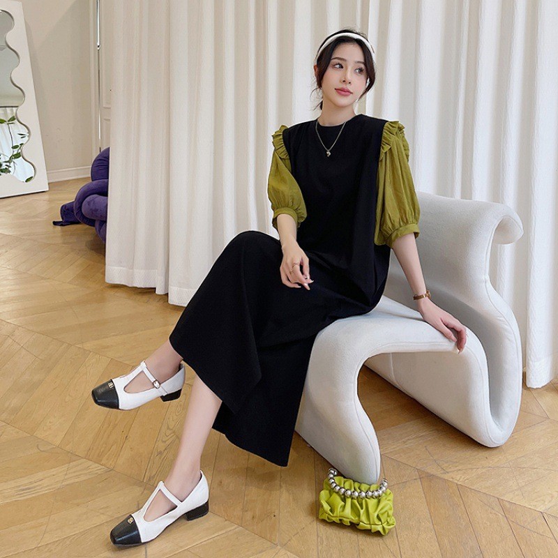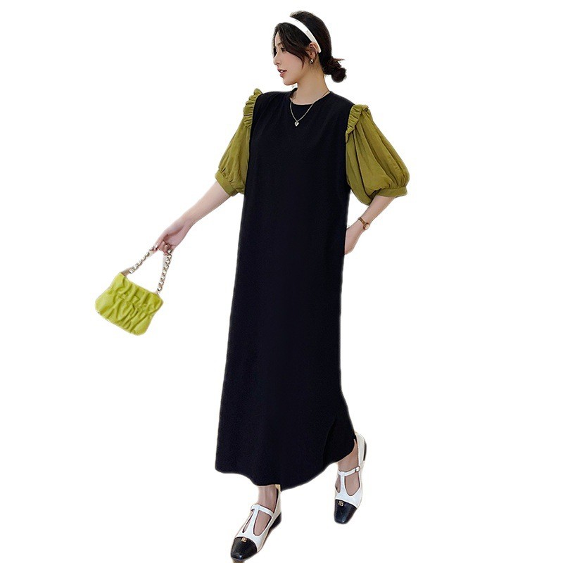 夏季新款拼接大码显瘦懒人裙加长款灯笼短袖T恤连衣裙女过膝长裙