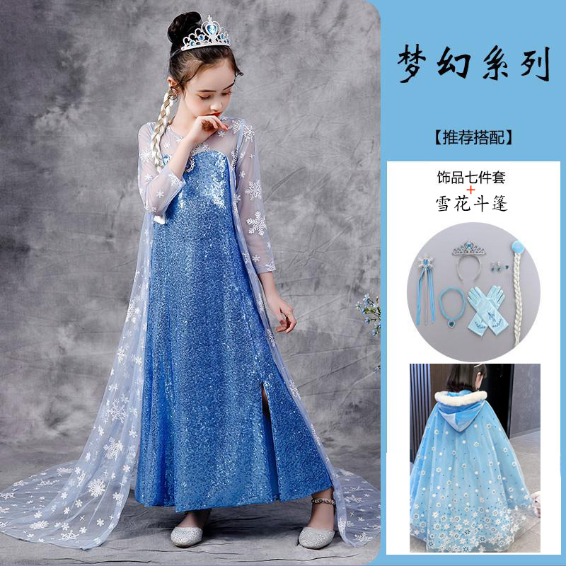 万圣节童装动画片艾莎公主裙蓝色披风拖地长裙cos服装elsa亮片裙