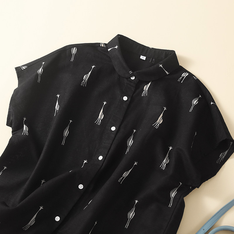 减龄气质棉麻印花衬衫女短袖上衣