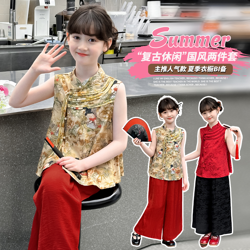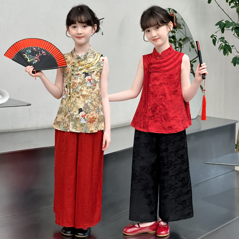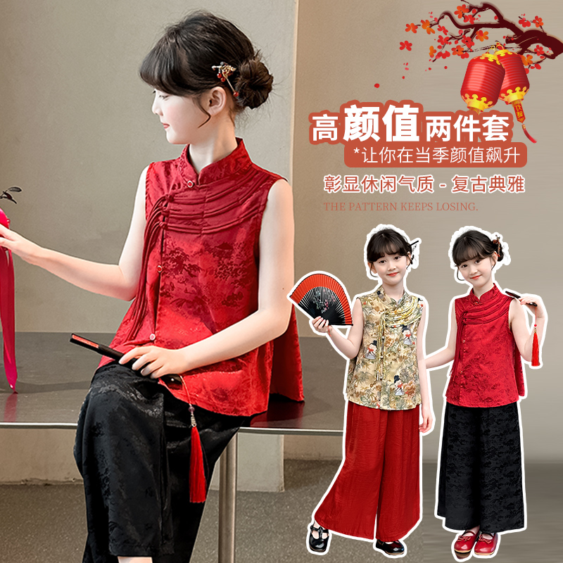 女童套装夏季2025新款盘扣无袖马甲阔腿裤中大童传统国风两件套潮