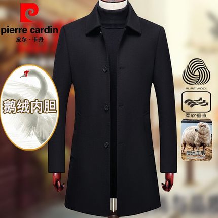 皮尔卡丹羊毛呢大衣男冬季中年鹅绒内胆加厚长款风衣双面羊绒外套