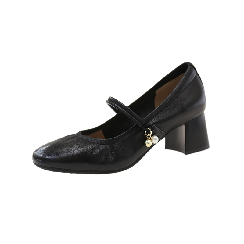 黑色头层羊皮粗跟单鞋女2025春夏季新款里外真皮柔软透气舒适
