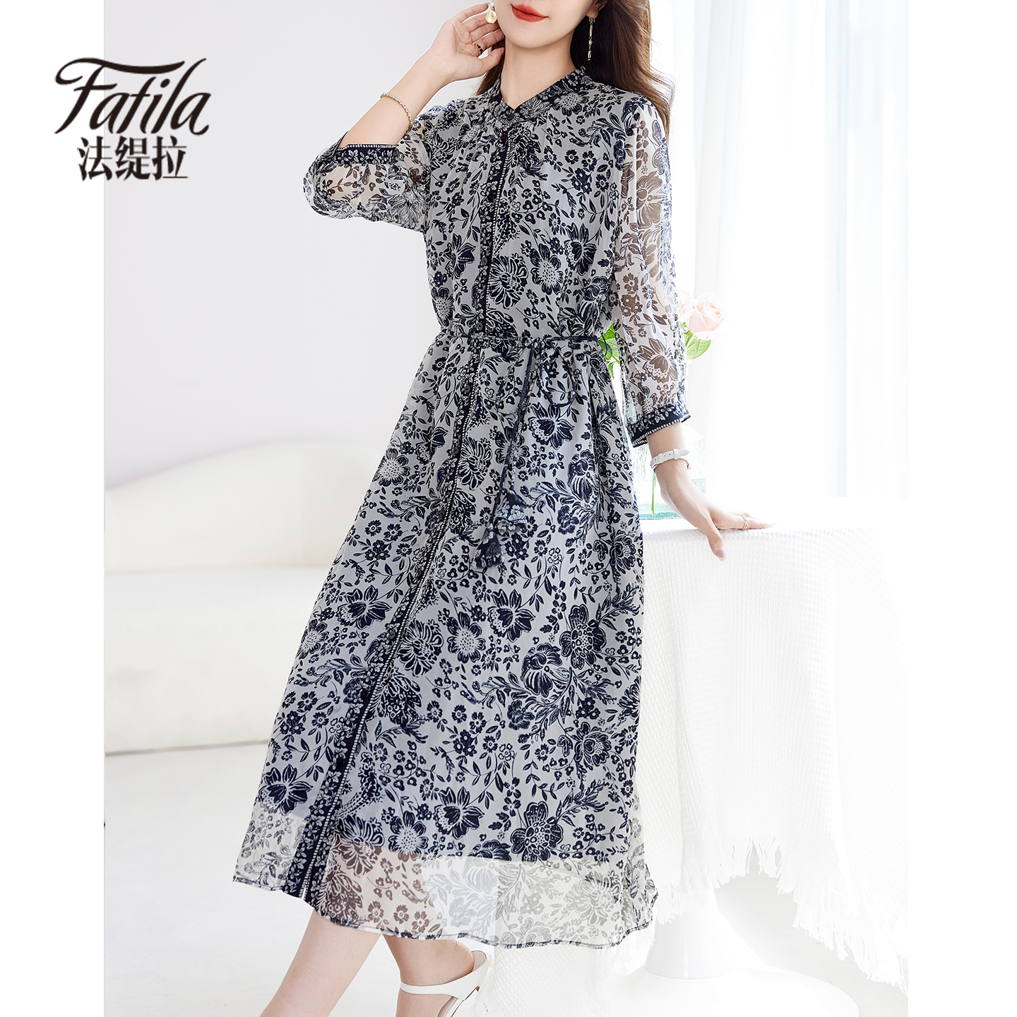 杭州时尚真丝连衣裙夏新款显瘦中长款衬衫桑蚕丝裙子年轻气质妈妈