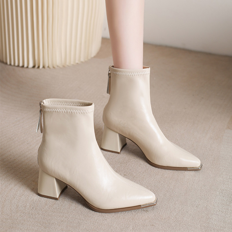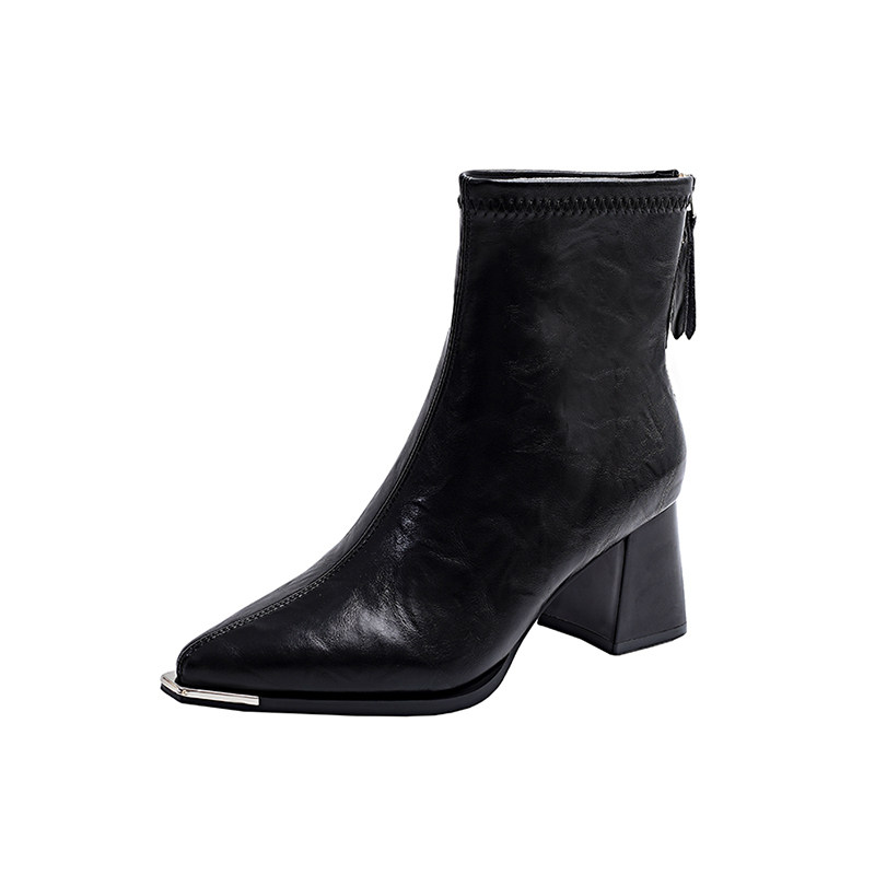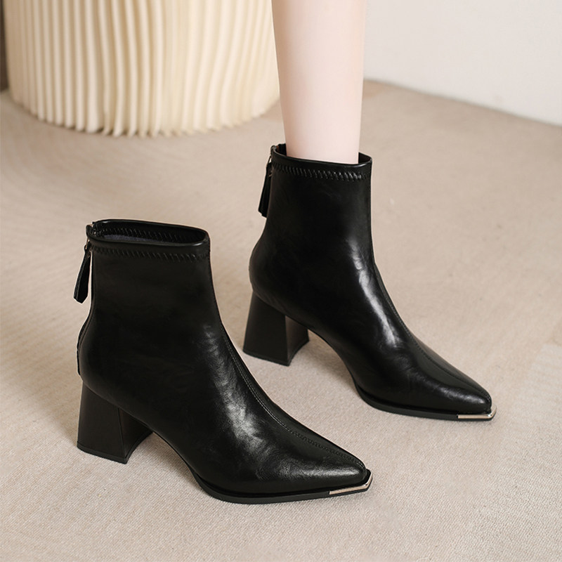 黑色马丁靴女款2025新款秋季复古金属尖头瘦瘦靴粗跟女靴高跟短靴