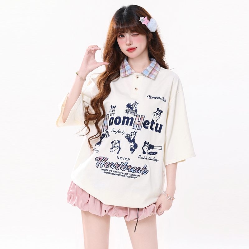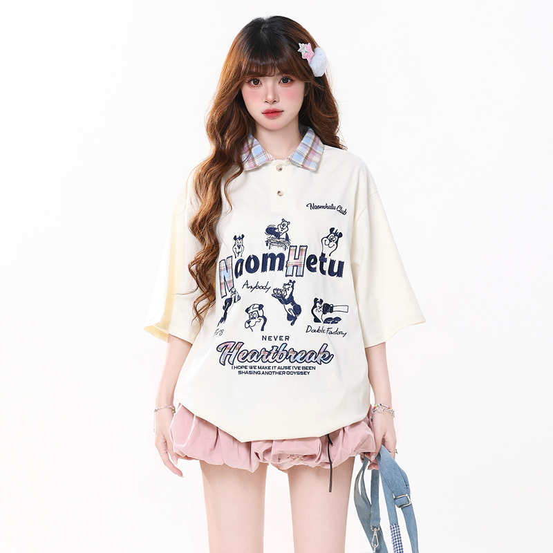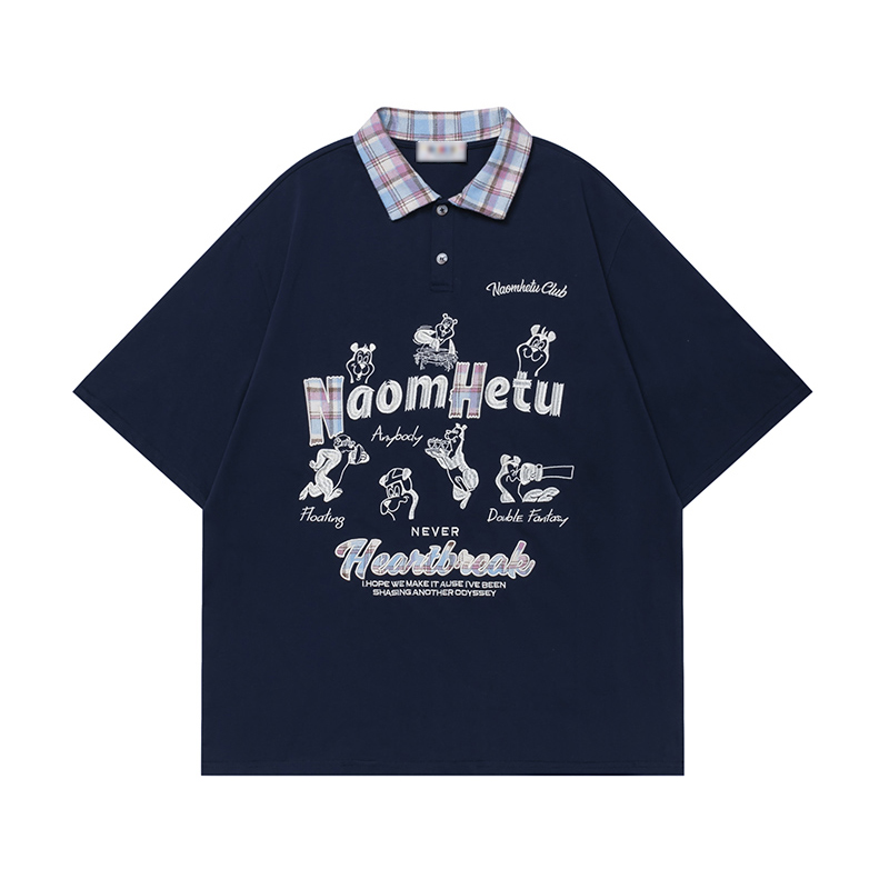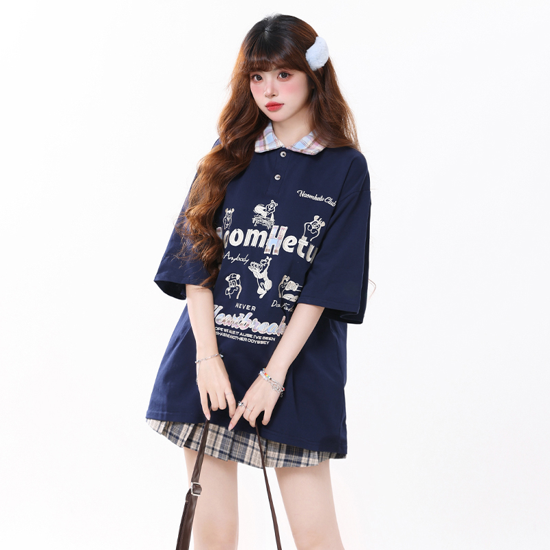 大码美式学院风深蓝色格子拼接Polo领短袖t恤女胖mm宽松显瘦上衣