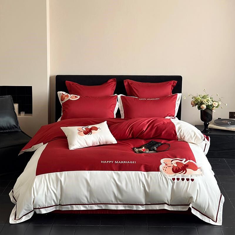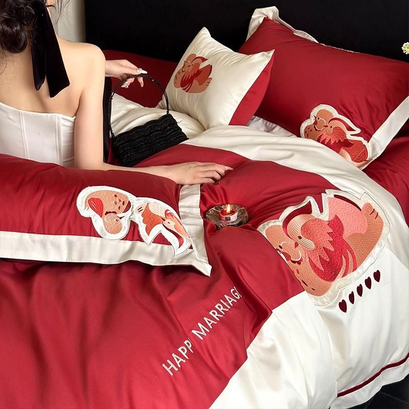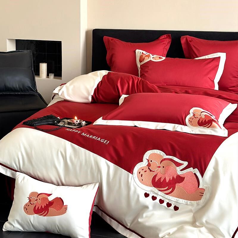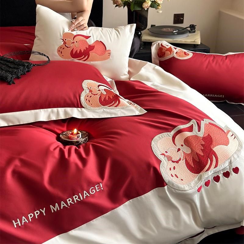 高级感结婚长绒棉四件套鸳鸯刺绣款全棉被套床单婚庆乔迁床品