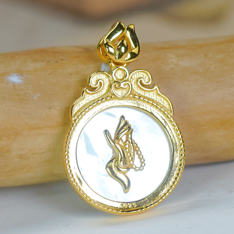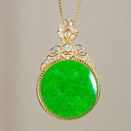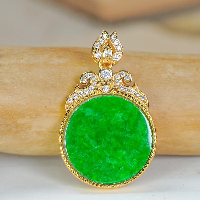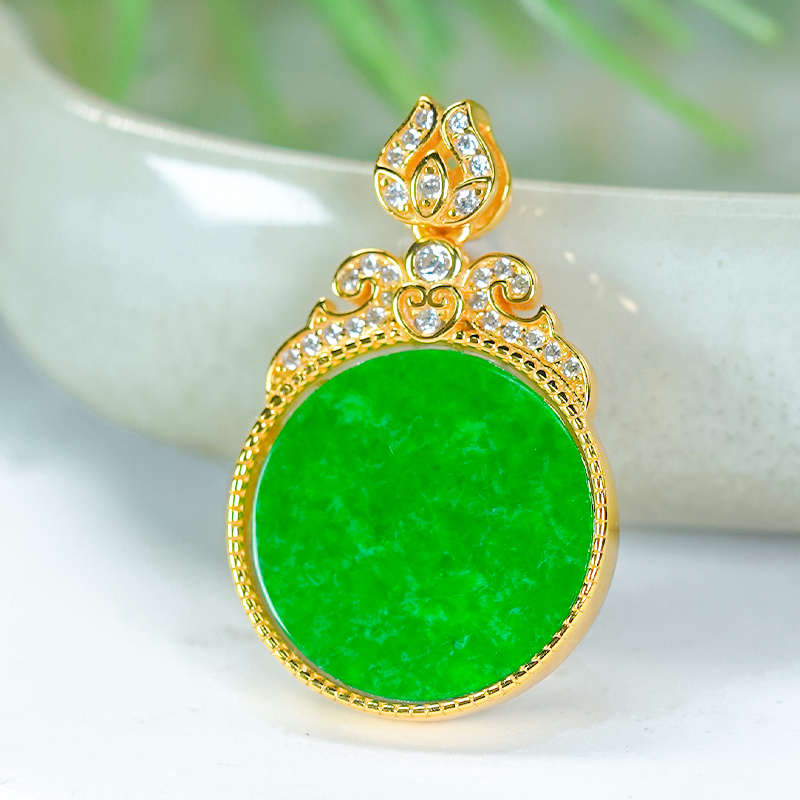 洛丽亚天然翡翠A货银镶嵌精致花苞扣头满阳绿翡翠如意圆牌吊坠