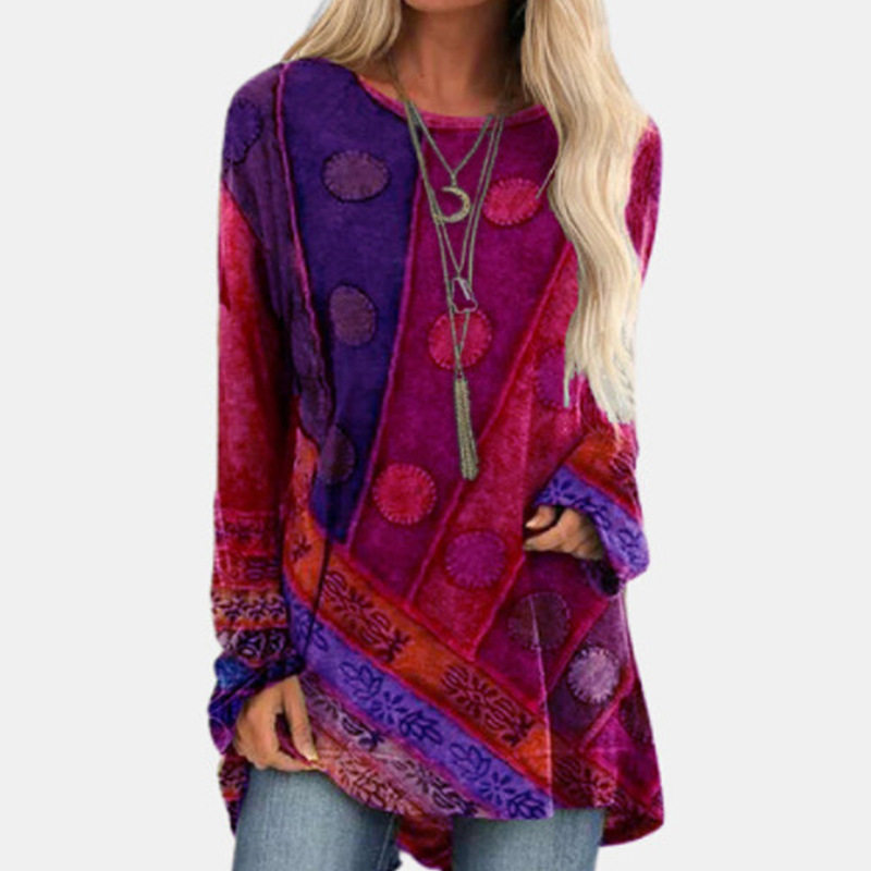大码女装2021秋季新品时尚圆领民族风印花宽松中长款长袖T恤S-5XL