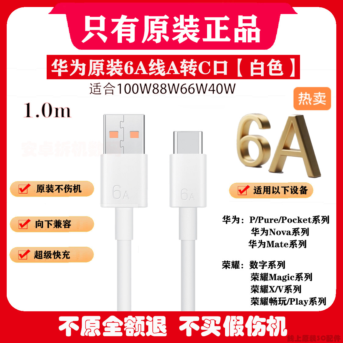 华为6A原装数据线超级快充适合100W88W66W40W充电器适配华为Pure 70/60/50/40/30/Nova/Mate/荣耀数字系列机