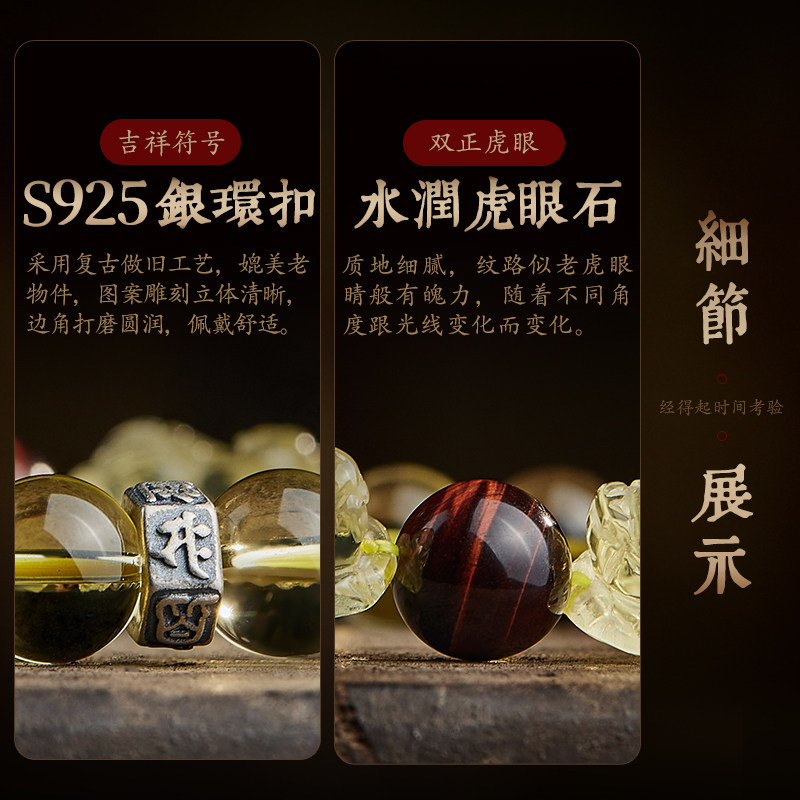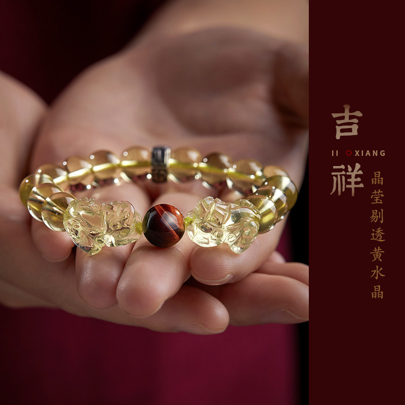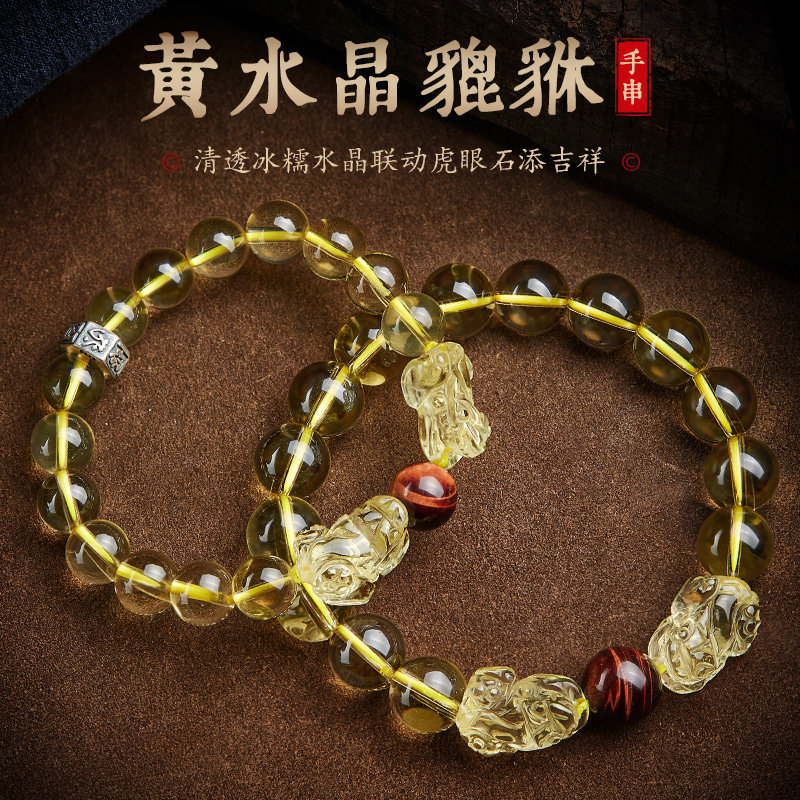 双貔貅黄水晶原石手链女冰糯黄宝石黄晶虎眼石手串男本命佛转运珠