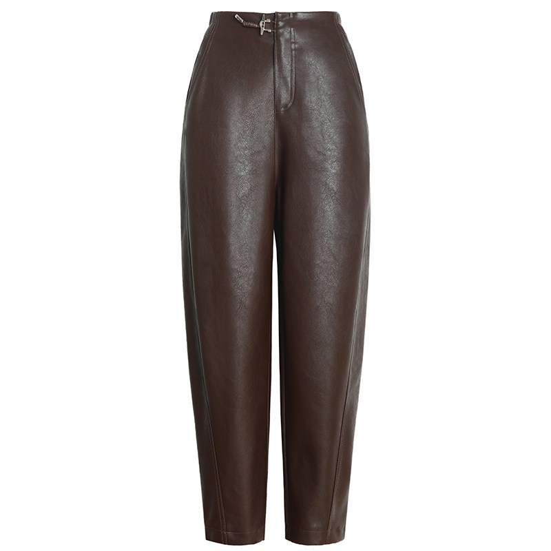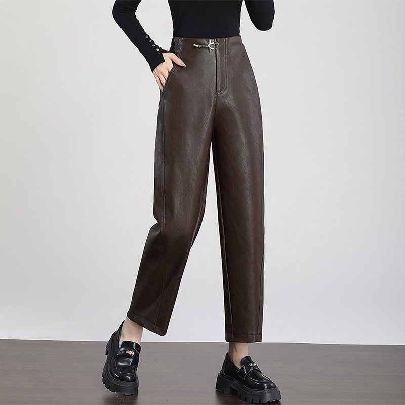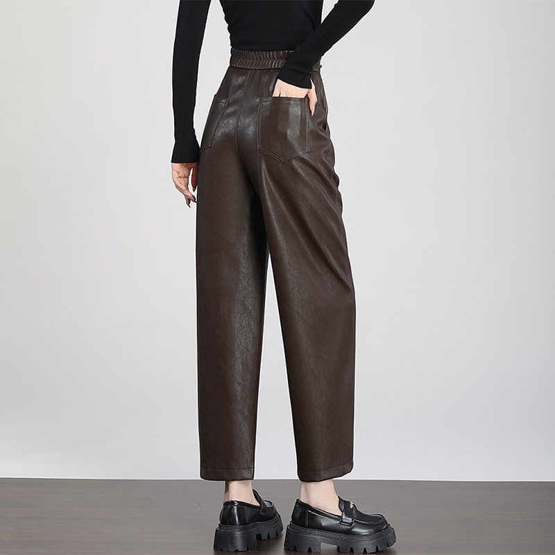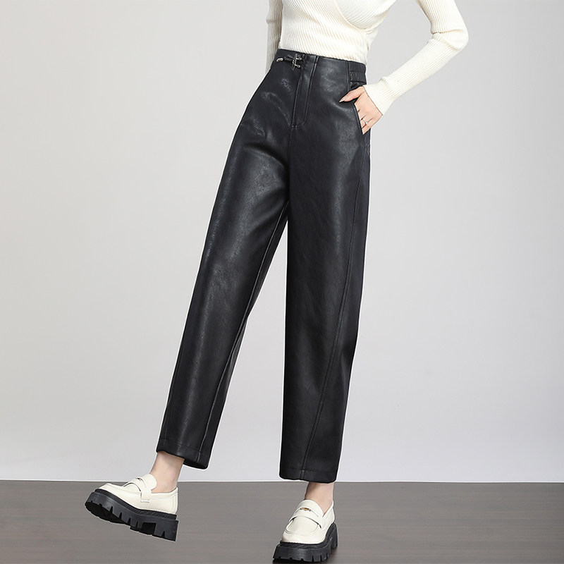 真皮皮裤女高腰宽松老爹裤九分裤