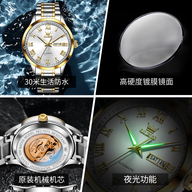 欧利时品牌男士手表时尚商务罗马双日历简约防水夜光全自动机械表