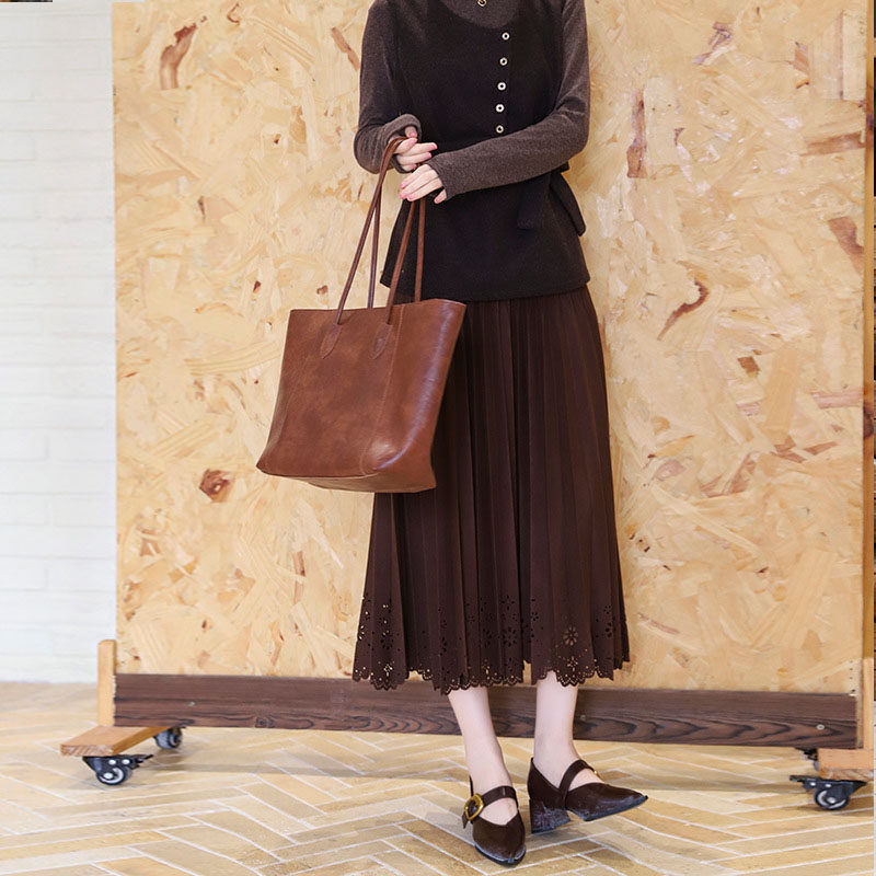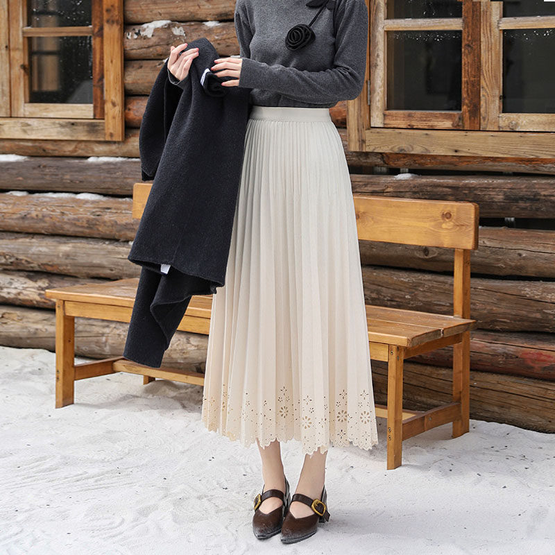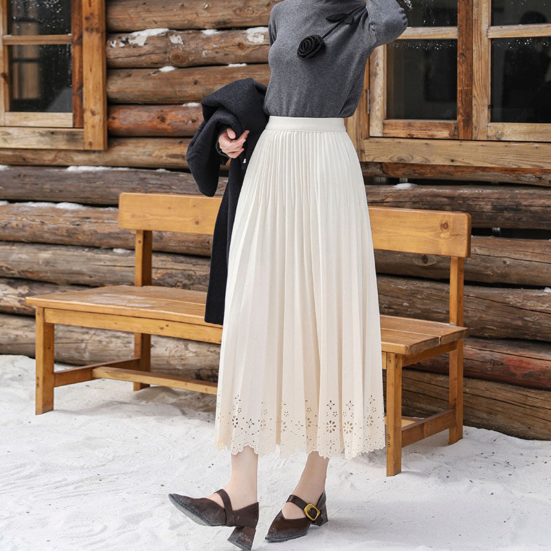 美拉德毛呢镂空蕾丝花边半身裙女2026春季新款a字垂感中长百褶裙