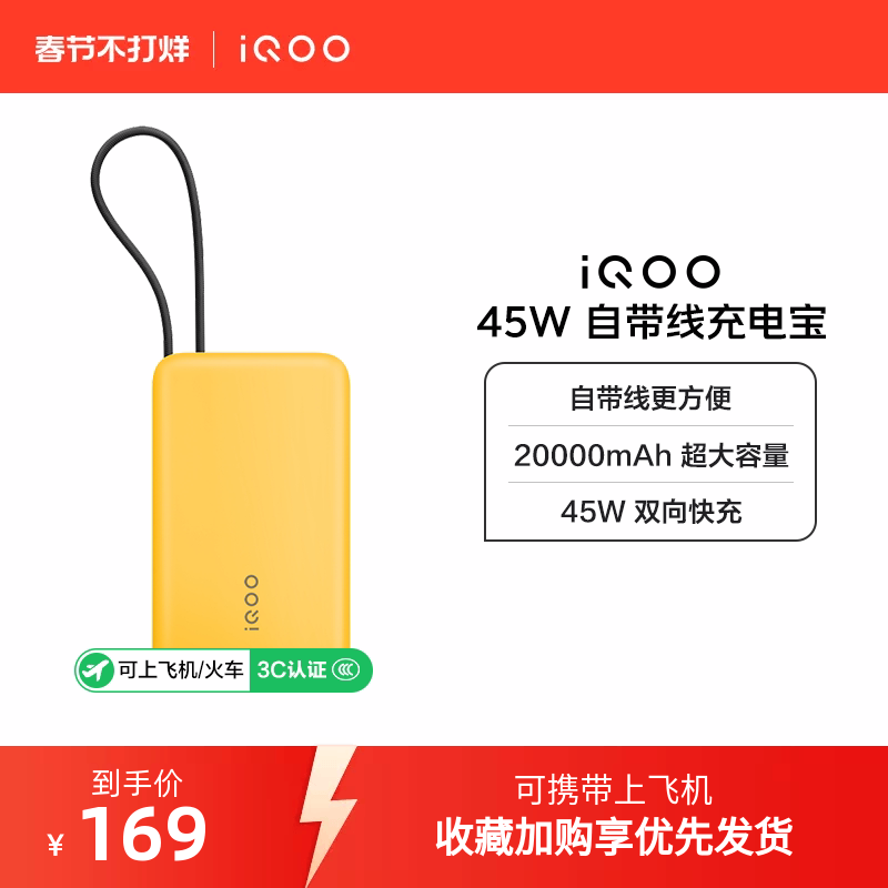 【3C认证】iQOO自带线充电宝20000毫安45W可上飞机大容量快充移动电源便携正品