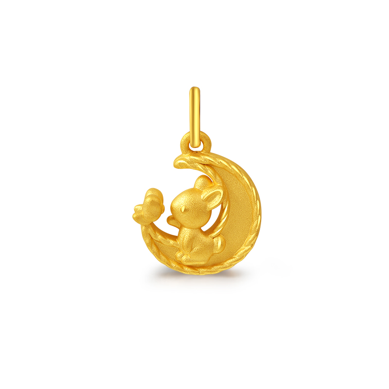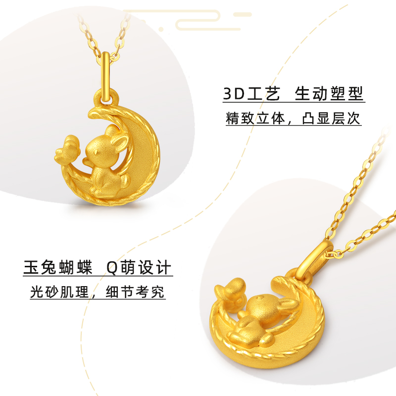 老庙黄金足金3D月牙蝴蝶生肖兔子挂坠可爱吊坠送赠银链节日女