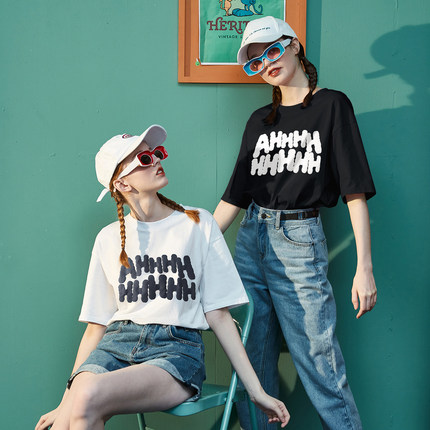女情侣装唐狮圆领上衣服潮T恤休闲AHHH~短袖t恤女夏装宽松ins半袖
