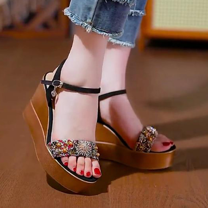 坡跟防水台凉鞋女2025年夏季新款时尚外穿水钻一字扣带露趾高跟鞋