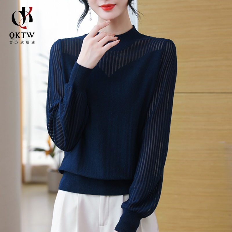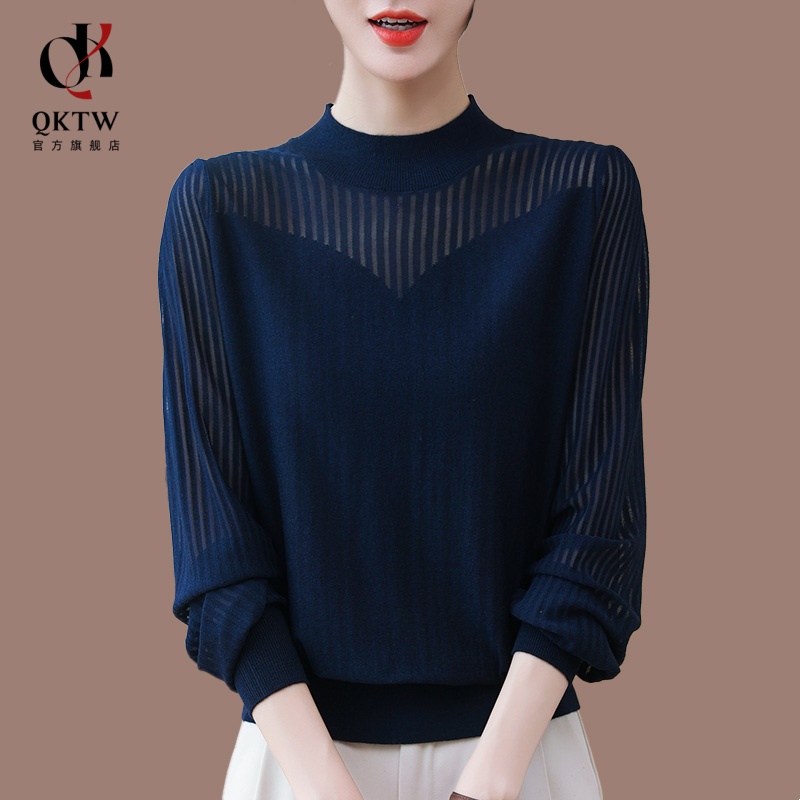 长袖t恤女2025新款秋冬中年时尚镂空网纱打底衫半高领针织衫上衣
