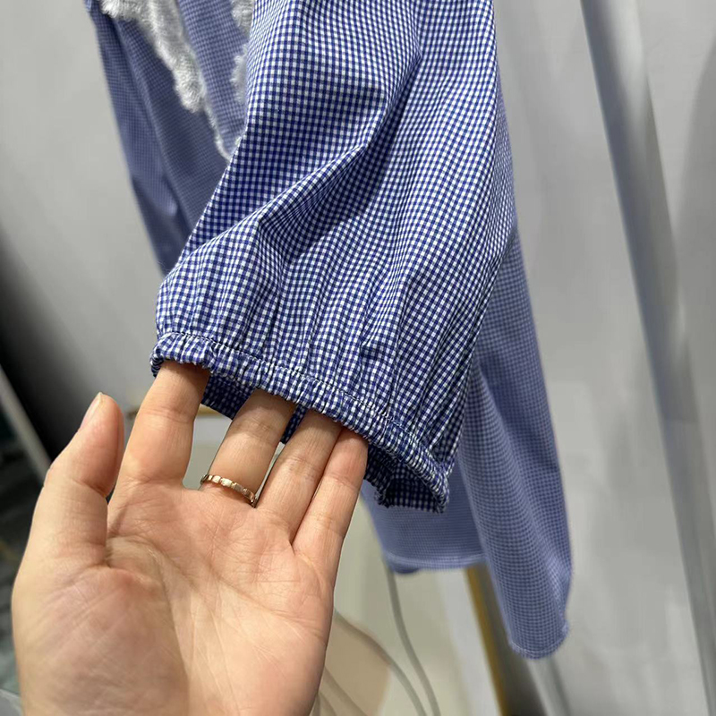 夏季新款蓝色棉质短袖女上衣圆领衬衫甜美棉布蕾丝拼接设计有大码