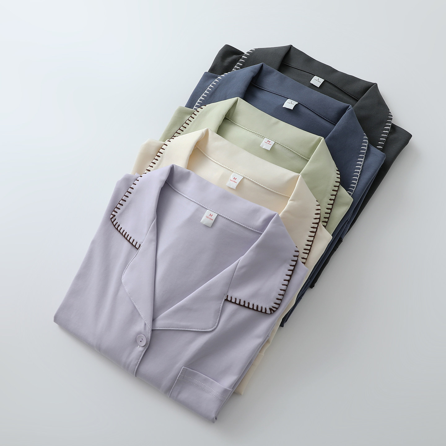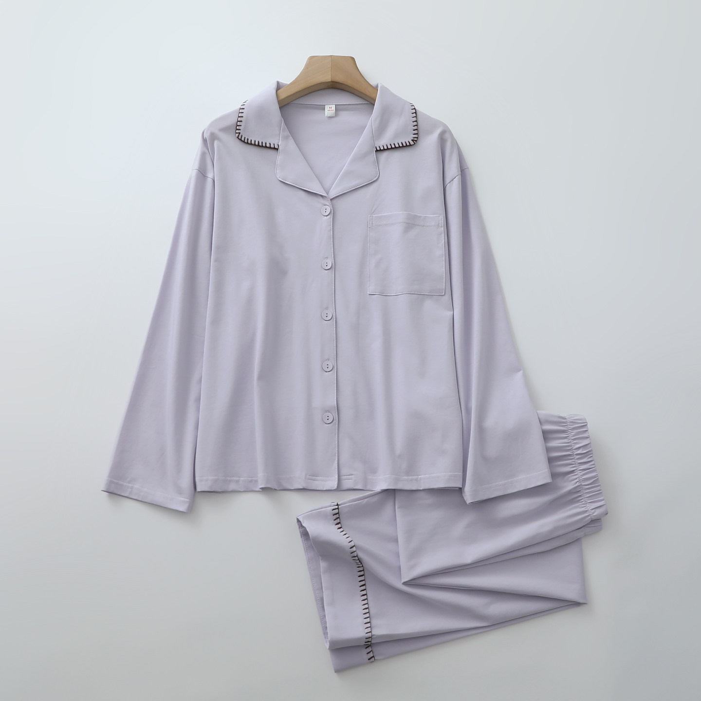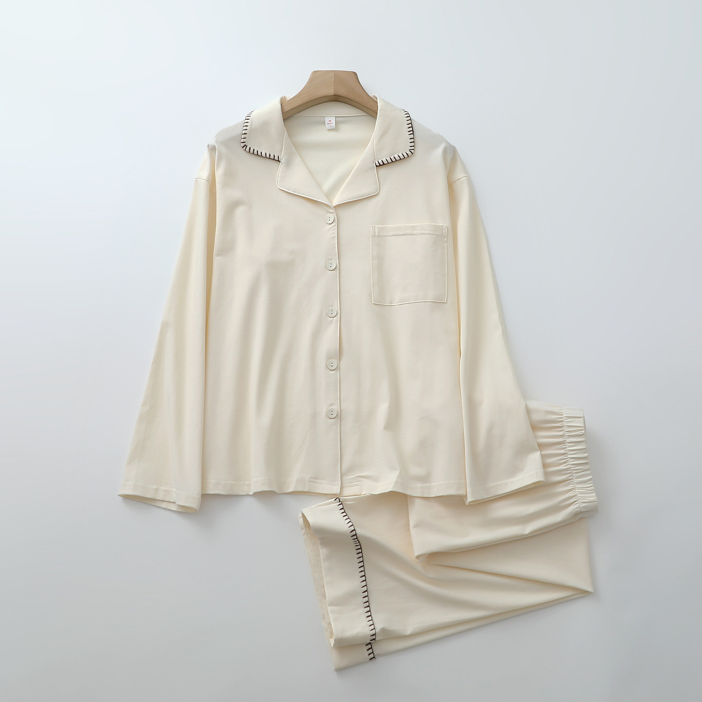 刺绣贝壳边情侣睡衣套装男女士纯棉开衫长袖长裤春夏薄家居睡眠服