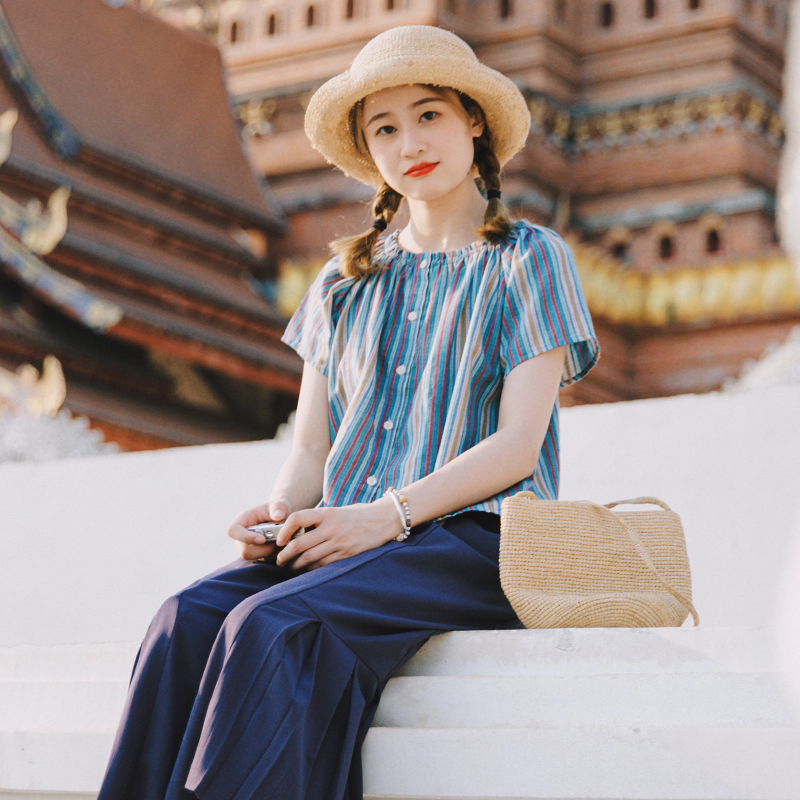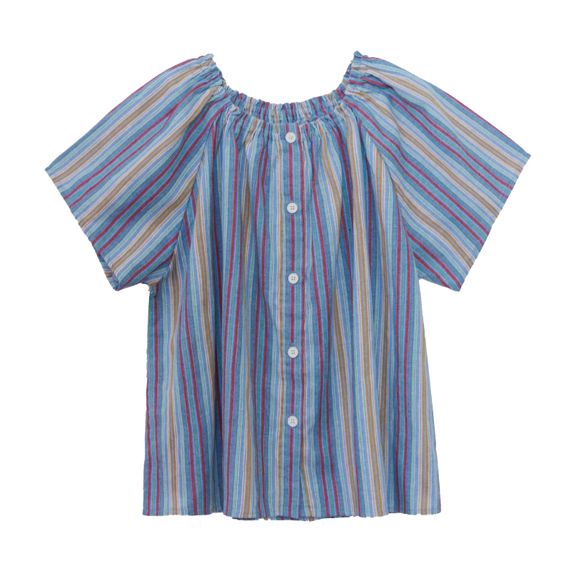 花吉B971彩色两穿领竖条纹纯棉短袖宽松衬衫女2025新款夏条纹衬衣