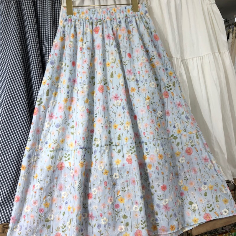 甜美粉色刺绣碎花半身裙女赫本风口袋高腰蓬蓬百搭A字伞裙中长裙