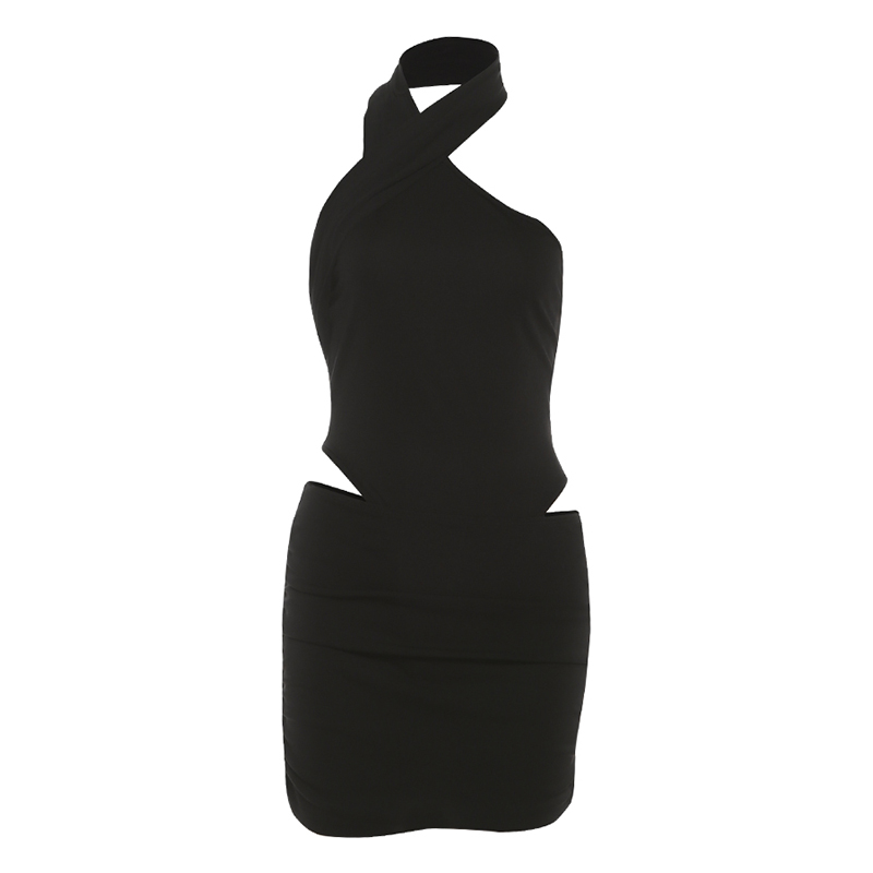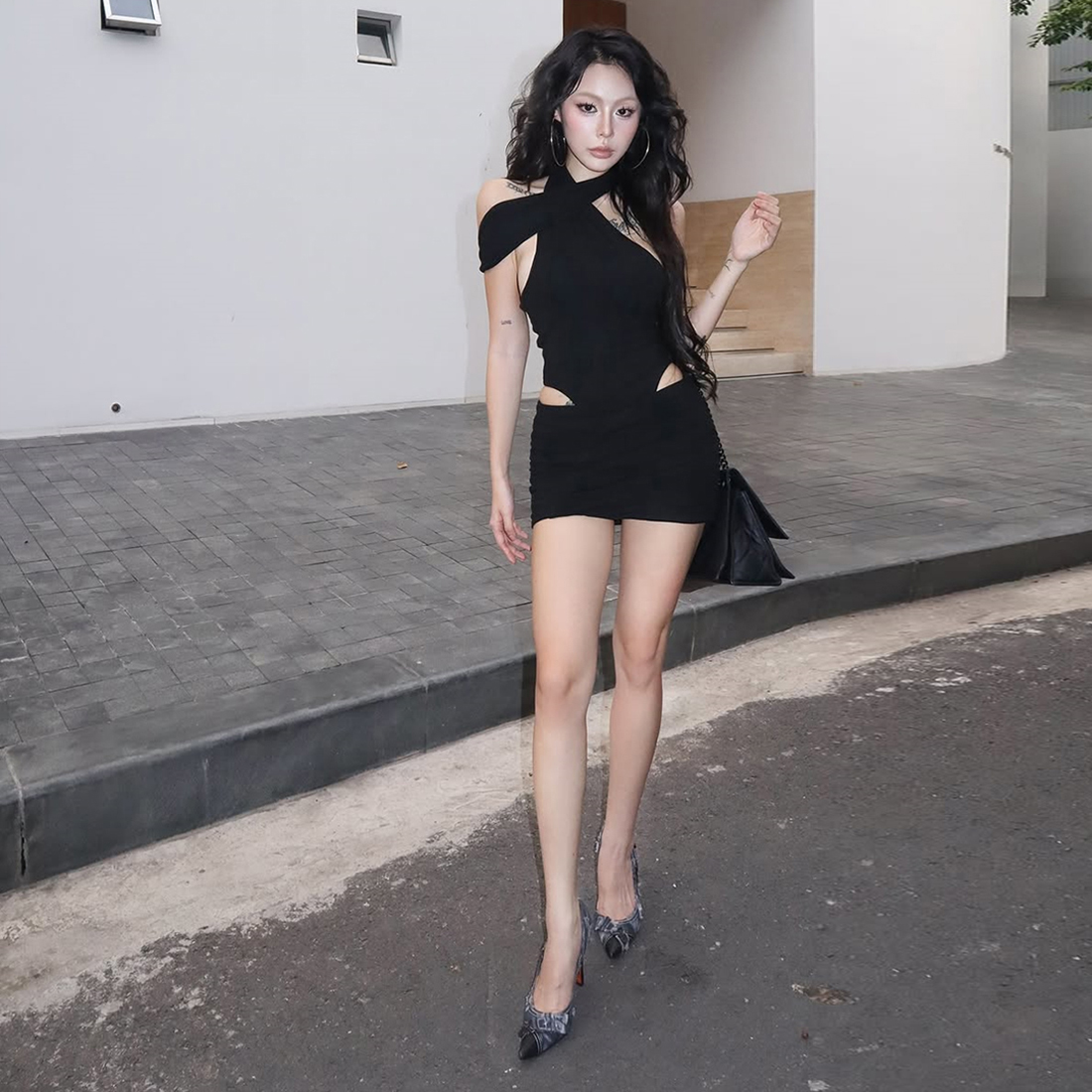 #Sisjuly#亚裔性感暗夜蛊惑 镂空设计不规则斜肩露背挂脖连衣裙女