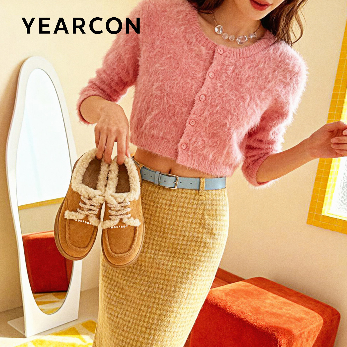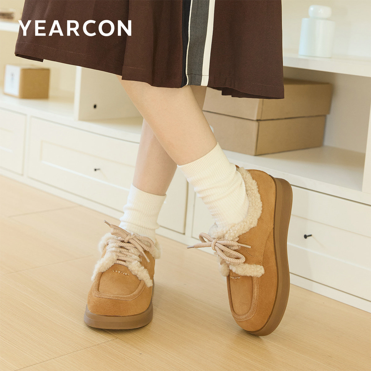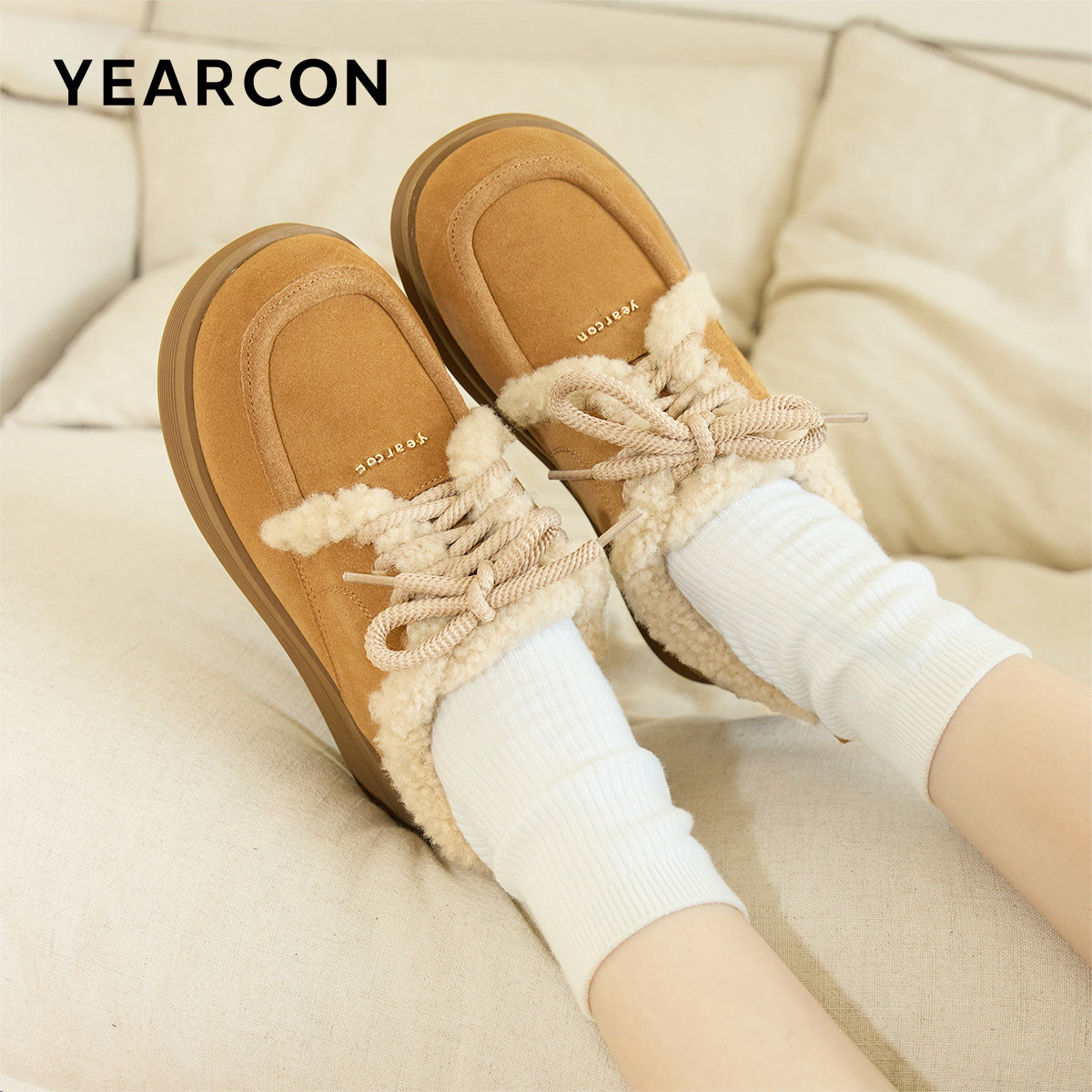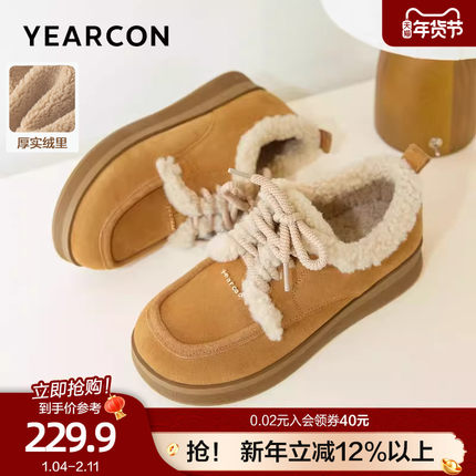 意尔康棉鞋女冬季外穿一脚蹬加绒加厚乐福鞋2025新款勃肯毛毛棉鞋