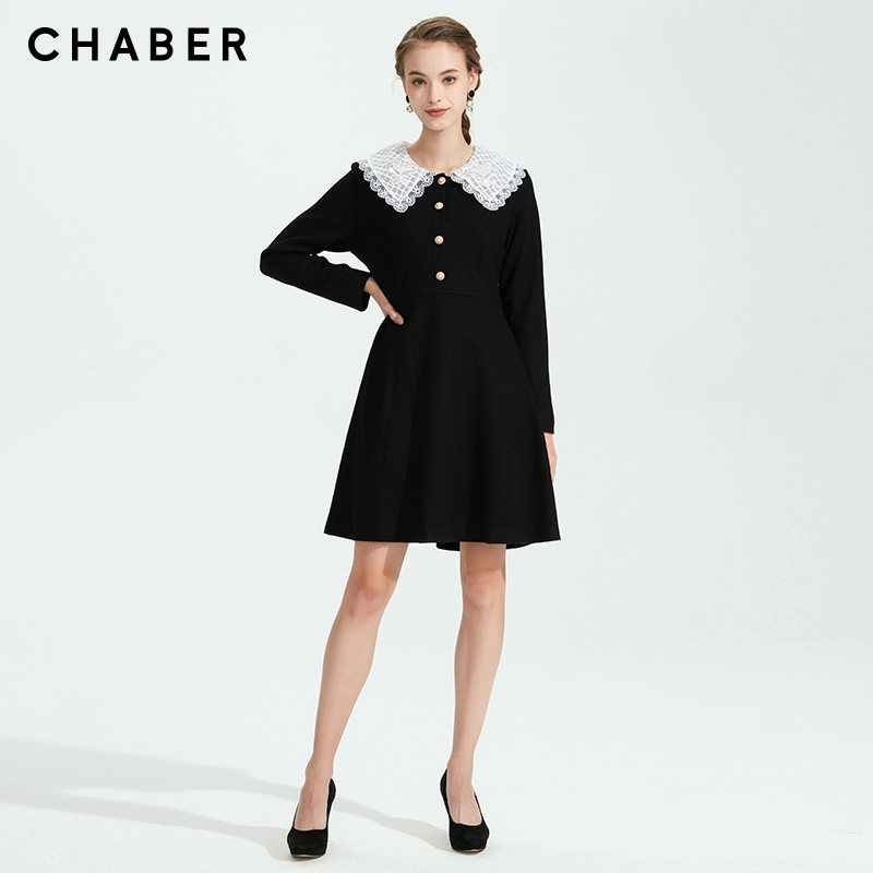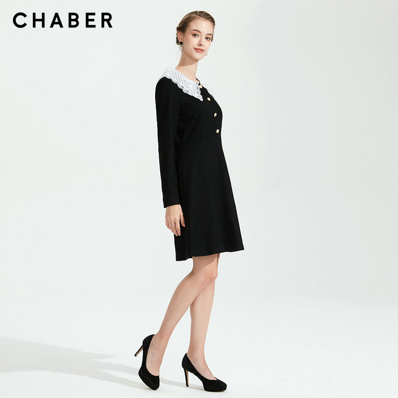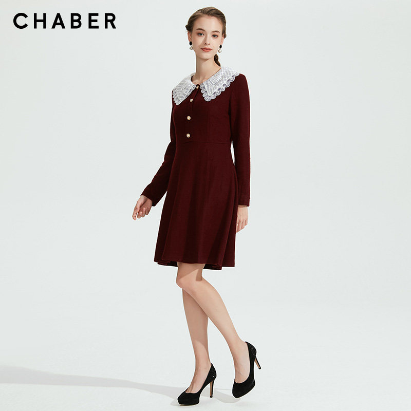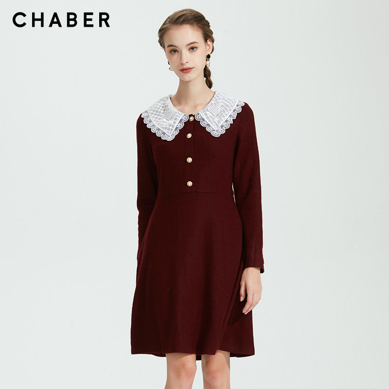 chaber巧帛秋冬新品娃娃领蕾丝高腰优雅长袖连衣裙长裙子女