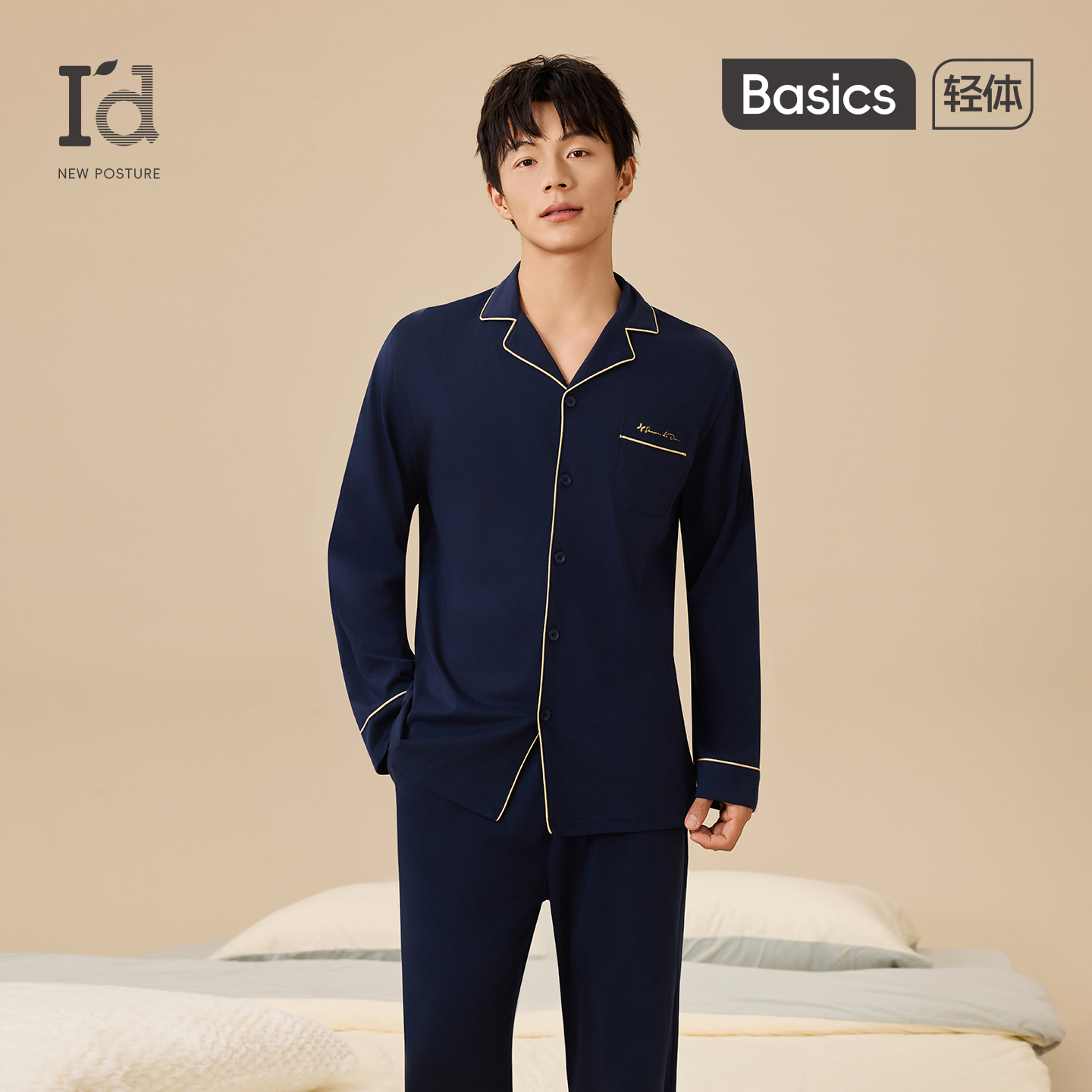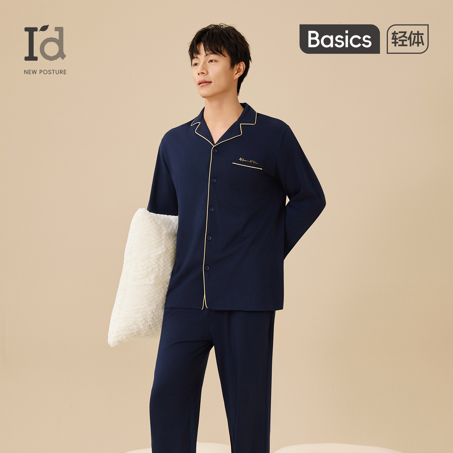 爱帝纯棉睡衣男士秋季新款纯色翻领长袖抗菌助眠家居服套装可外穿