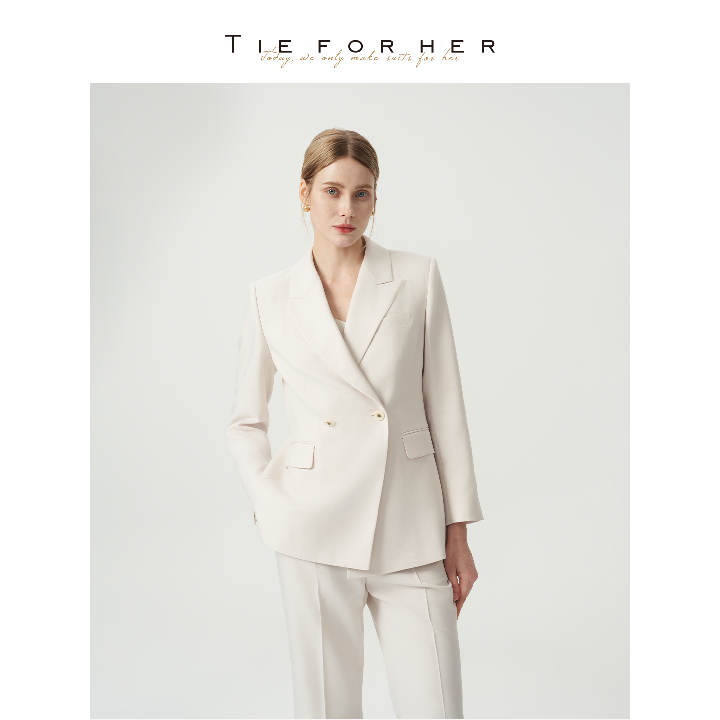 TieForHer Tzee2李冰冰同款杏白色西装直筒裤两件套女士套装TZ201