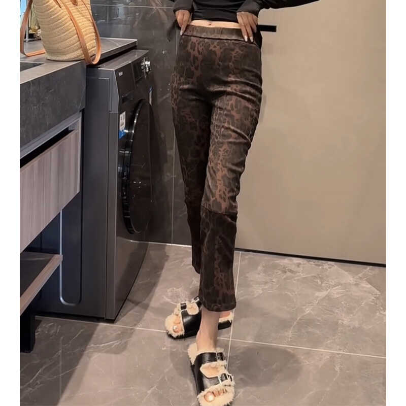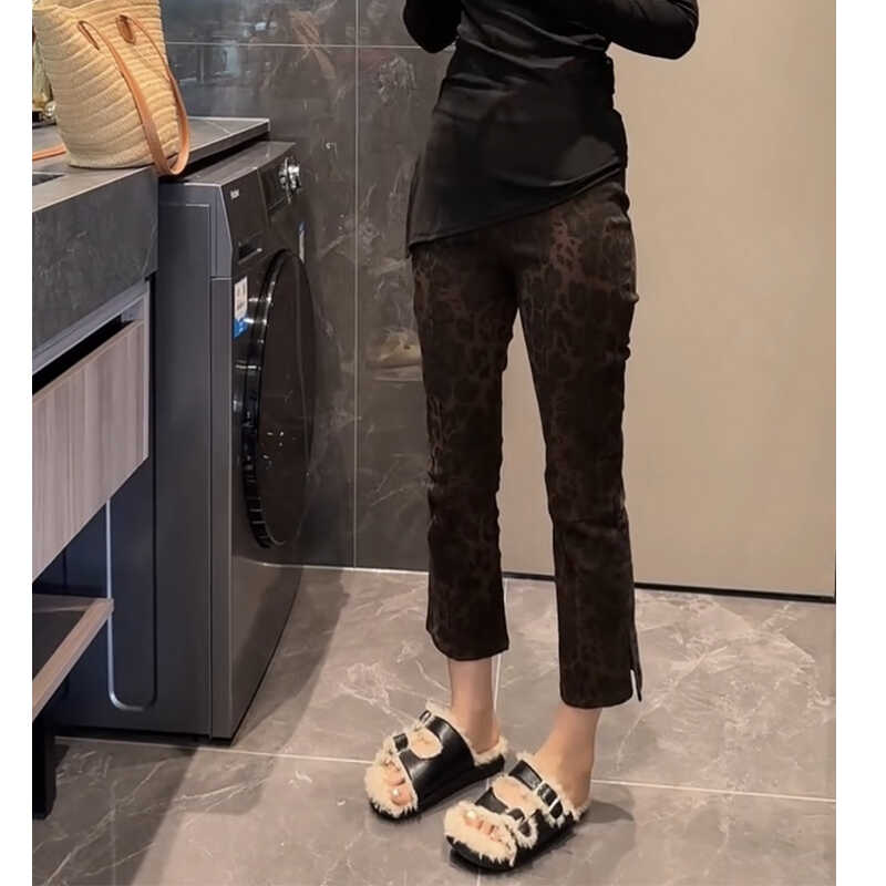 欧货侧开叉豹纹牛仔裤女2024年秋冬弹力显瘦铅笔裤修身九分直筒裤