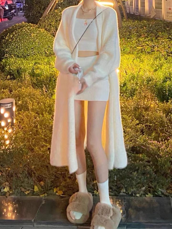 ins风过膝长毛衣开衫包臀短裙背心甜辣修身三件套 冷清氛围感大衣