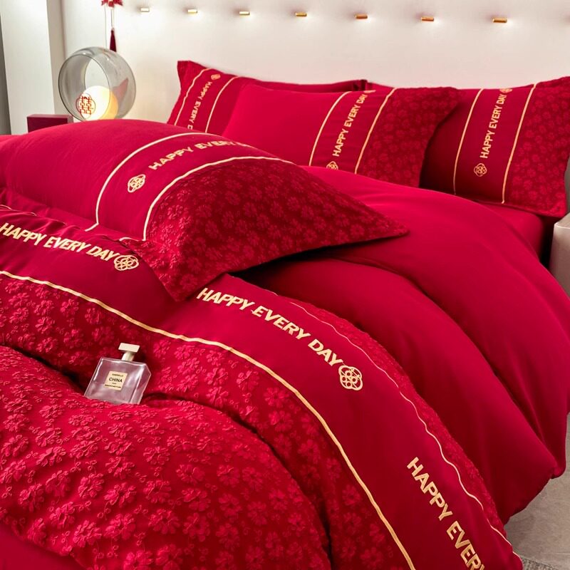 简约全棉结婚四件套大红u色床单被套婚庆床上用品婚房婚礼