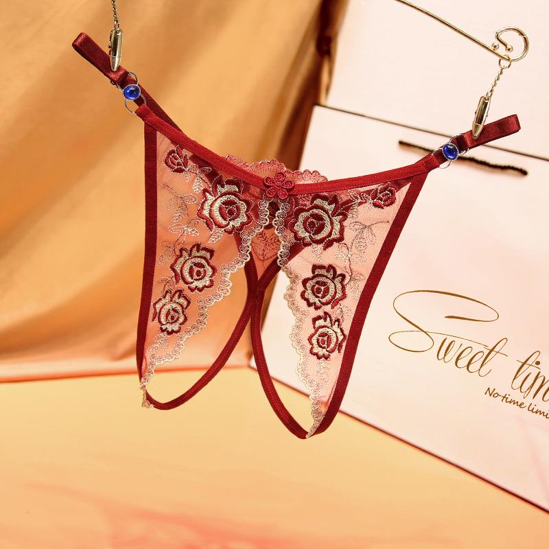日系开档可调节大小蕾丝内裤女生低腰速干诱惑镂空性感丁字裤黑色