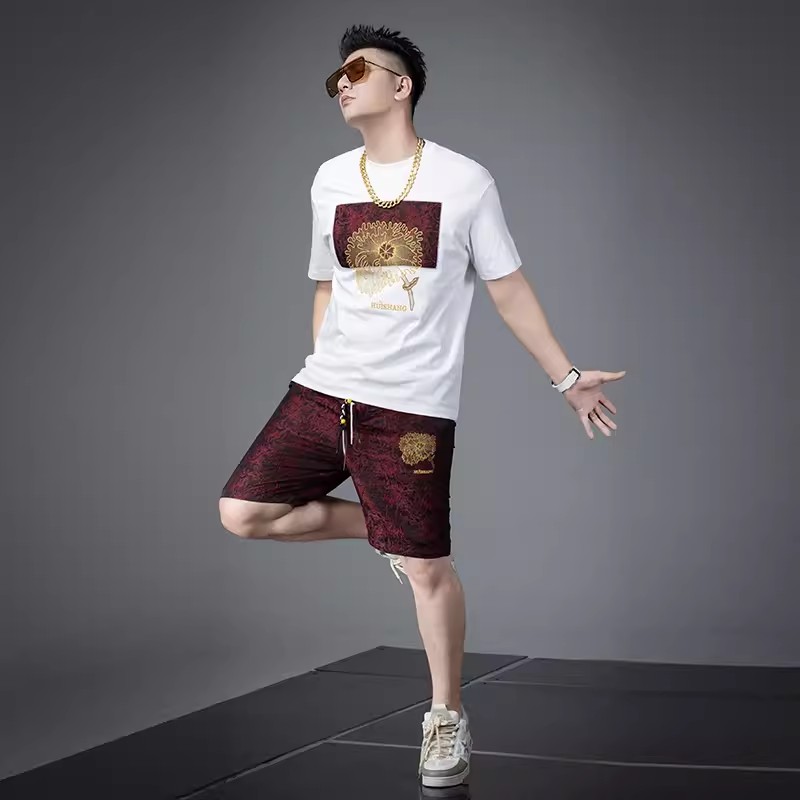 欧货圣希梵男士夏装套装2025新款潮流玫瑰刺绣短袖T恤两件套短裤