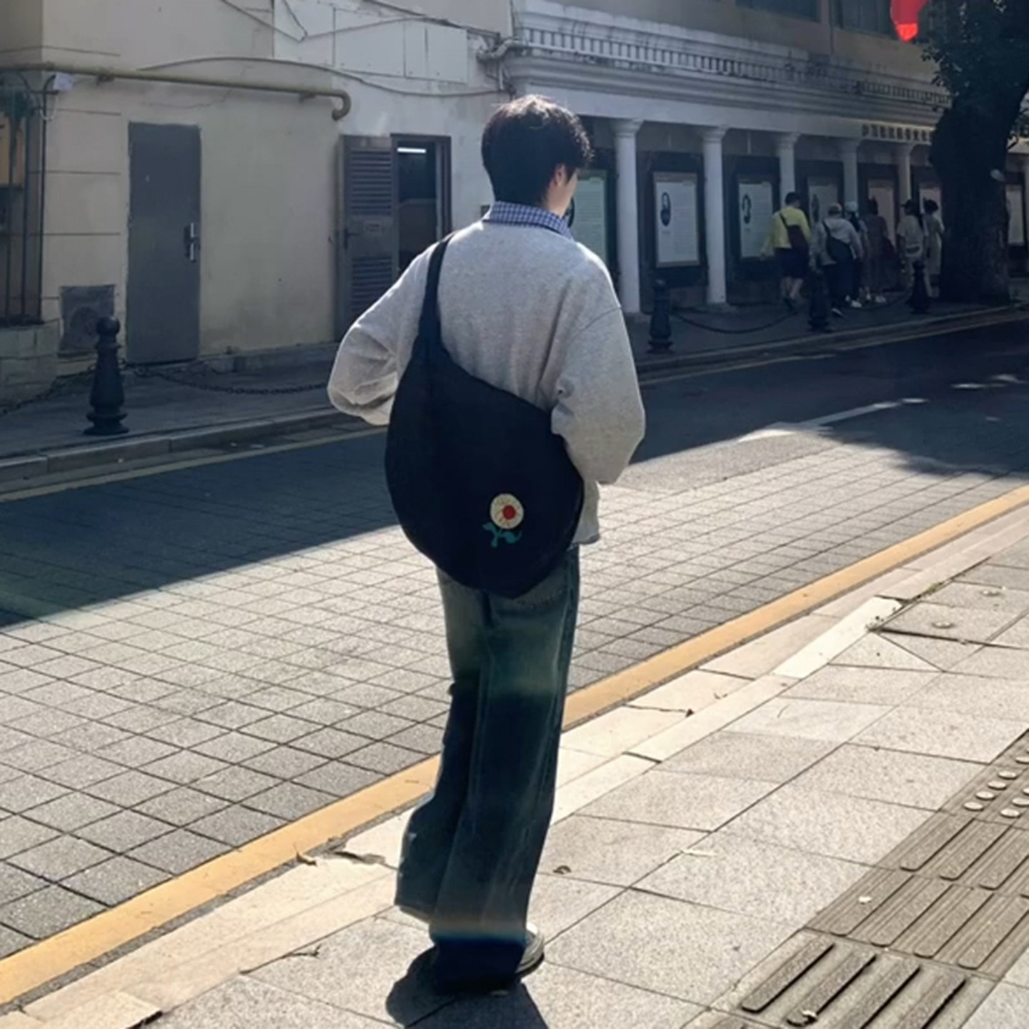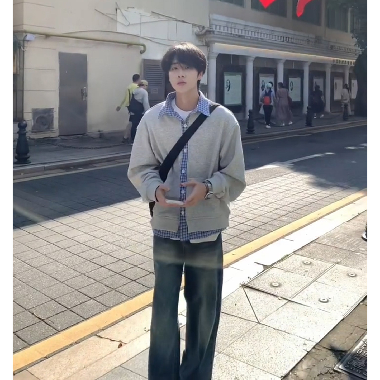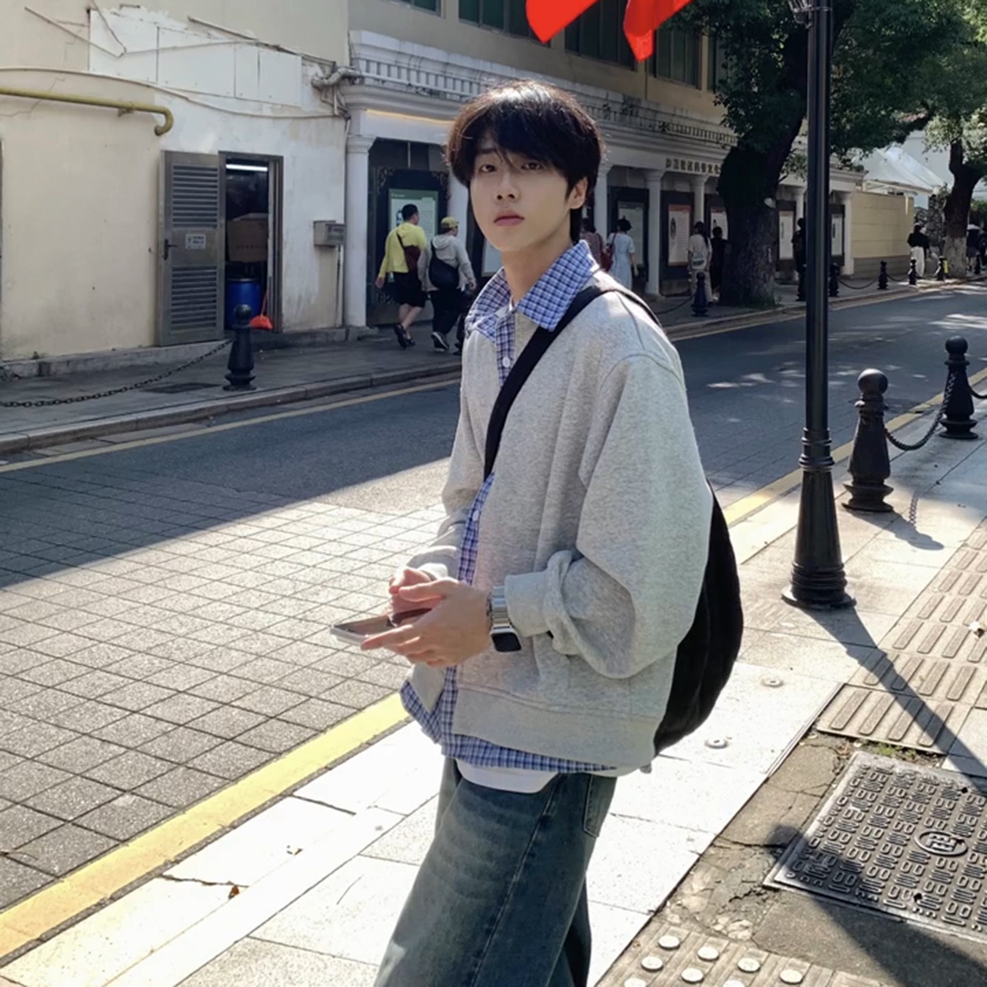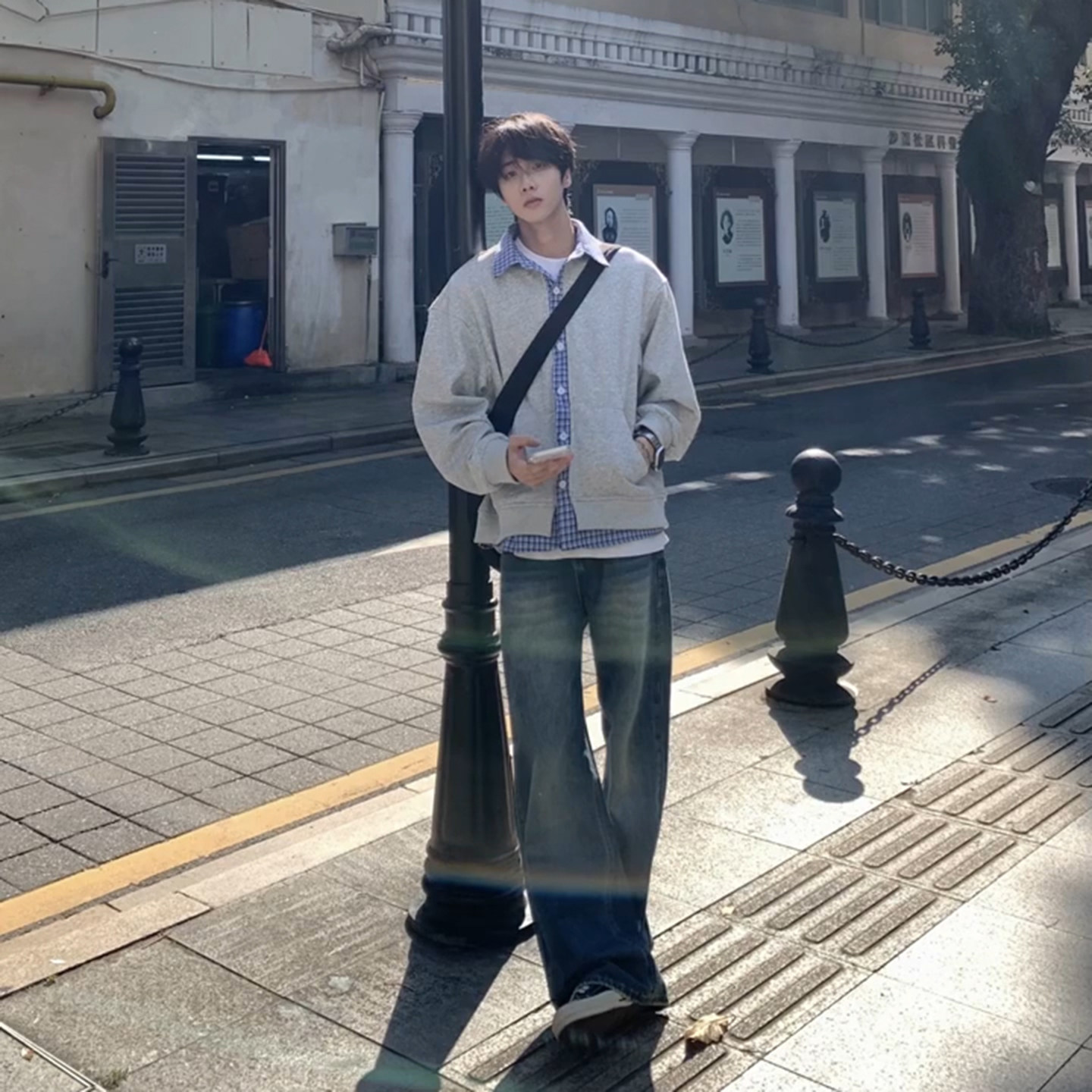 假两件格子拼接衬衫领卫衣男生韩系一整套ootd穿搭复古阔腿牛仔裤