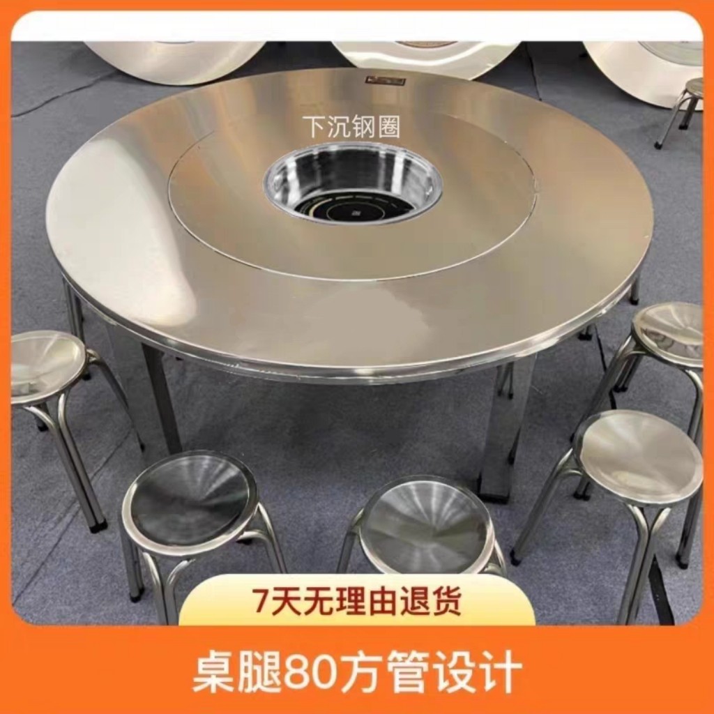 下沉式内置转盘火锅桌特大特粗80方管桌脚不锈钢连体圆桌折叠圆桌