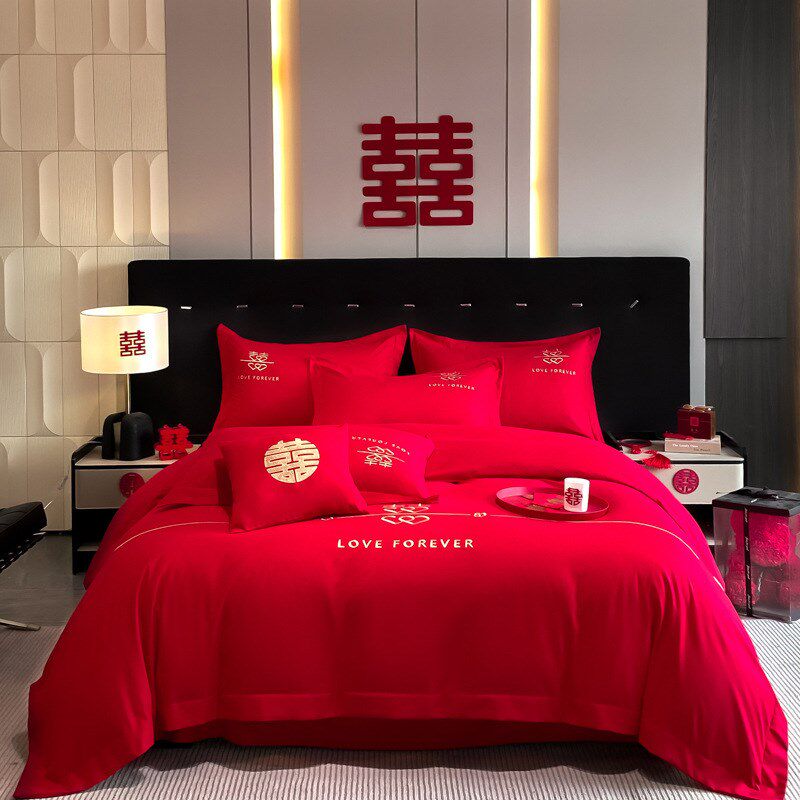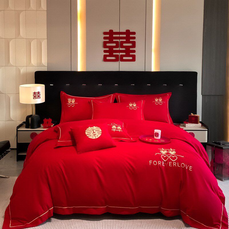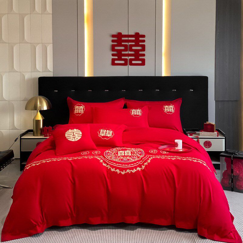 婚房婚礼红色床单婚o嫁被套被罩四件套新婚结婚床上用品大陪嫁