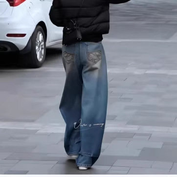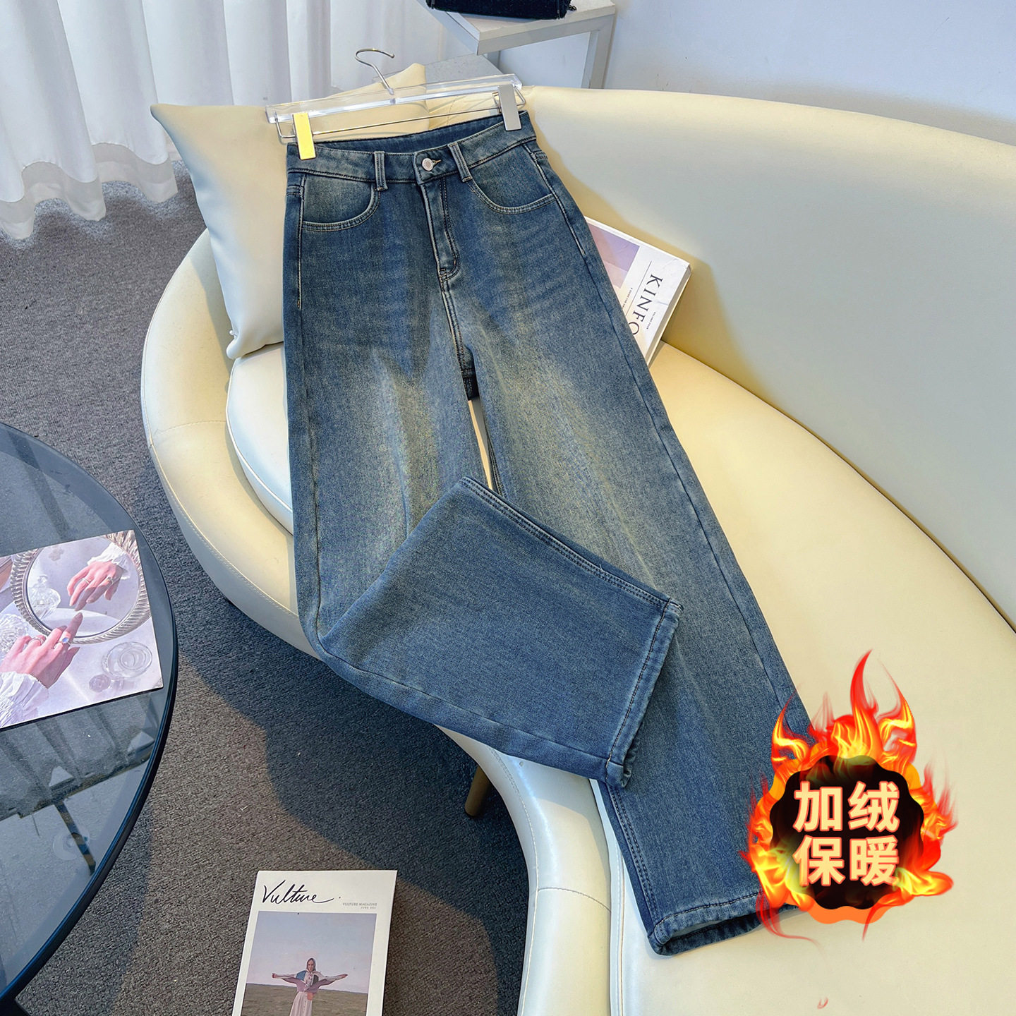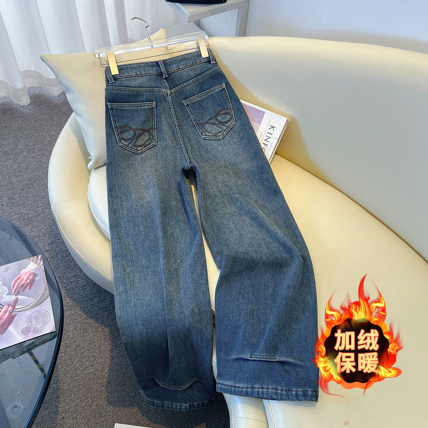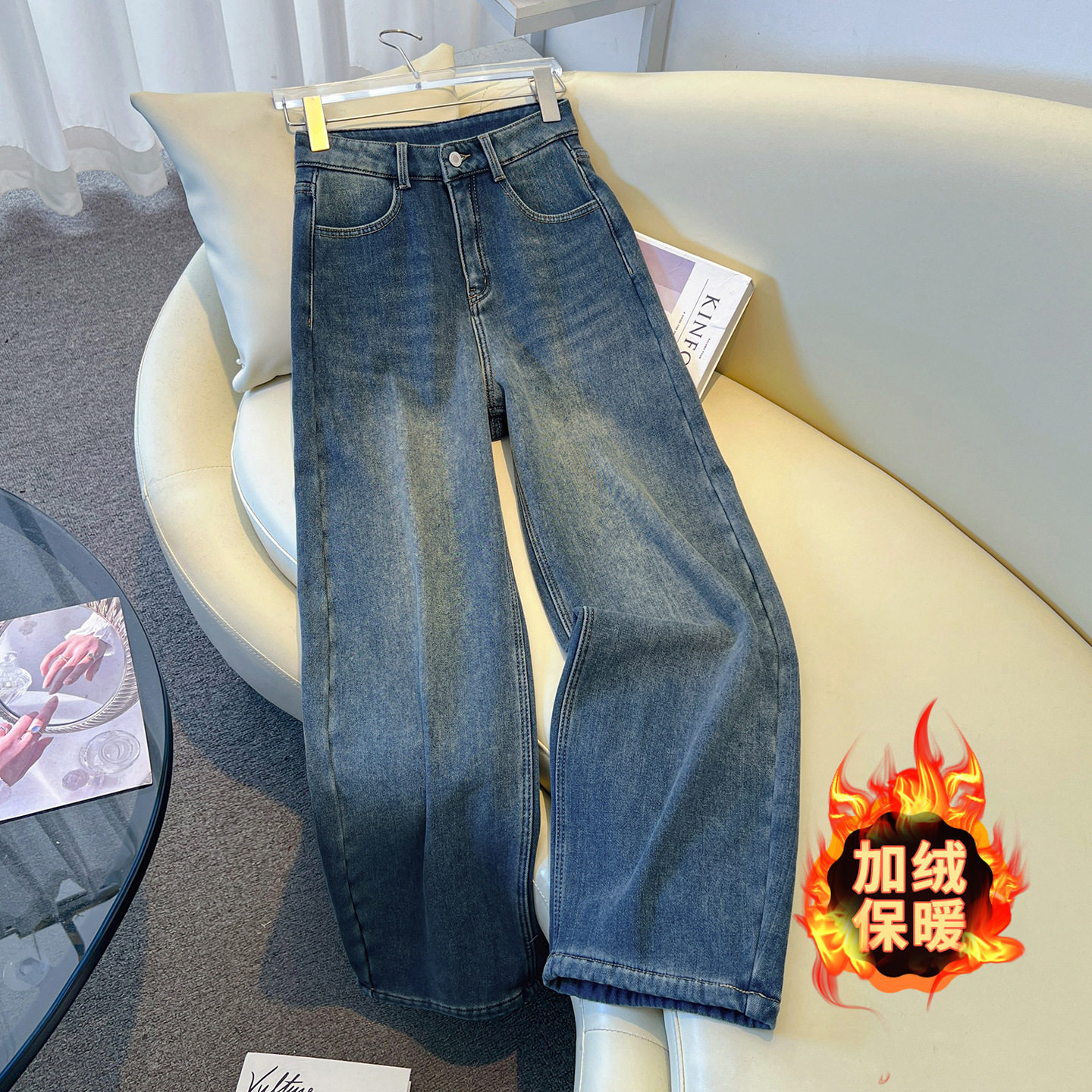 水洗蓝色牛仔阔腿裤女2025年秋冬季新款高腰加绒加厚宽松直筒长裤