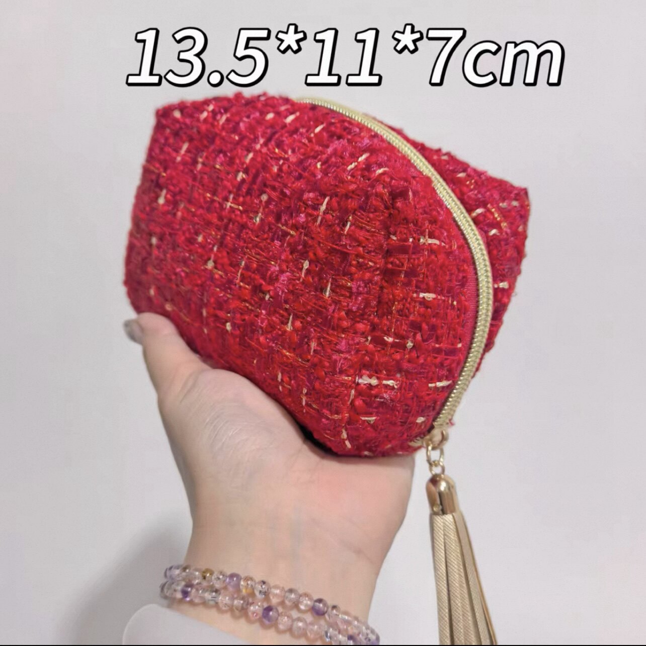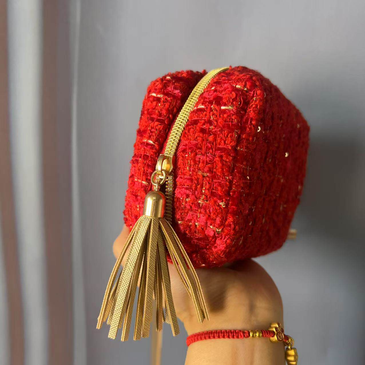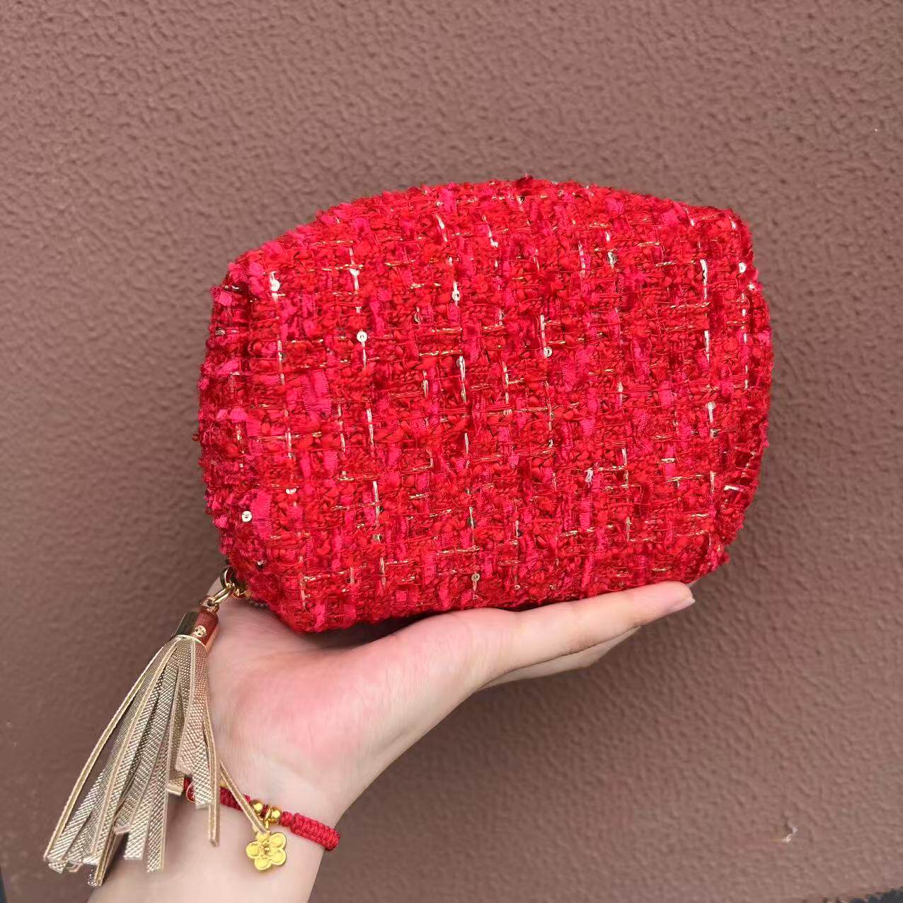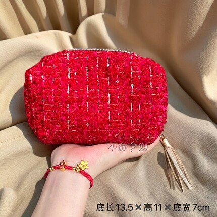 欧来雅新款高级红色粗纺小香风大牌手拿包化妆包收纳包