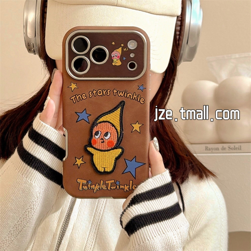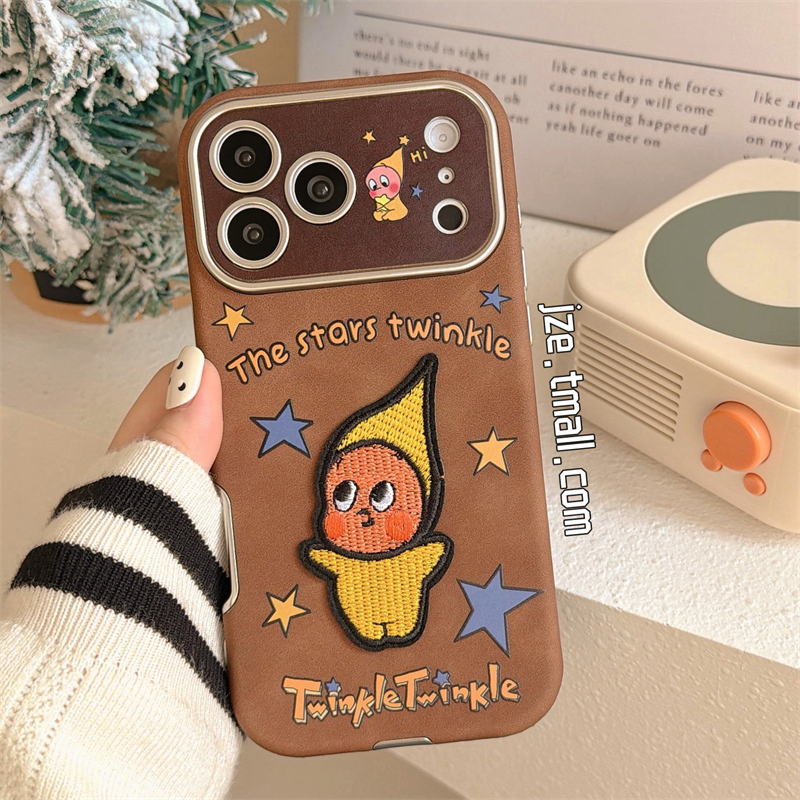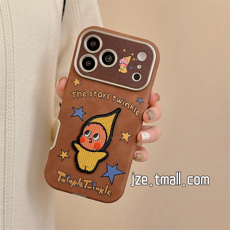 jze 棕色大视窗卡通星星小人刺绣适用苹果17ProMax手机壳iphone15新款16pro女款13超火15pro全包防摔保护套14