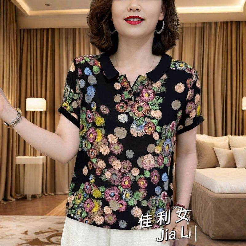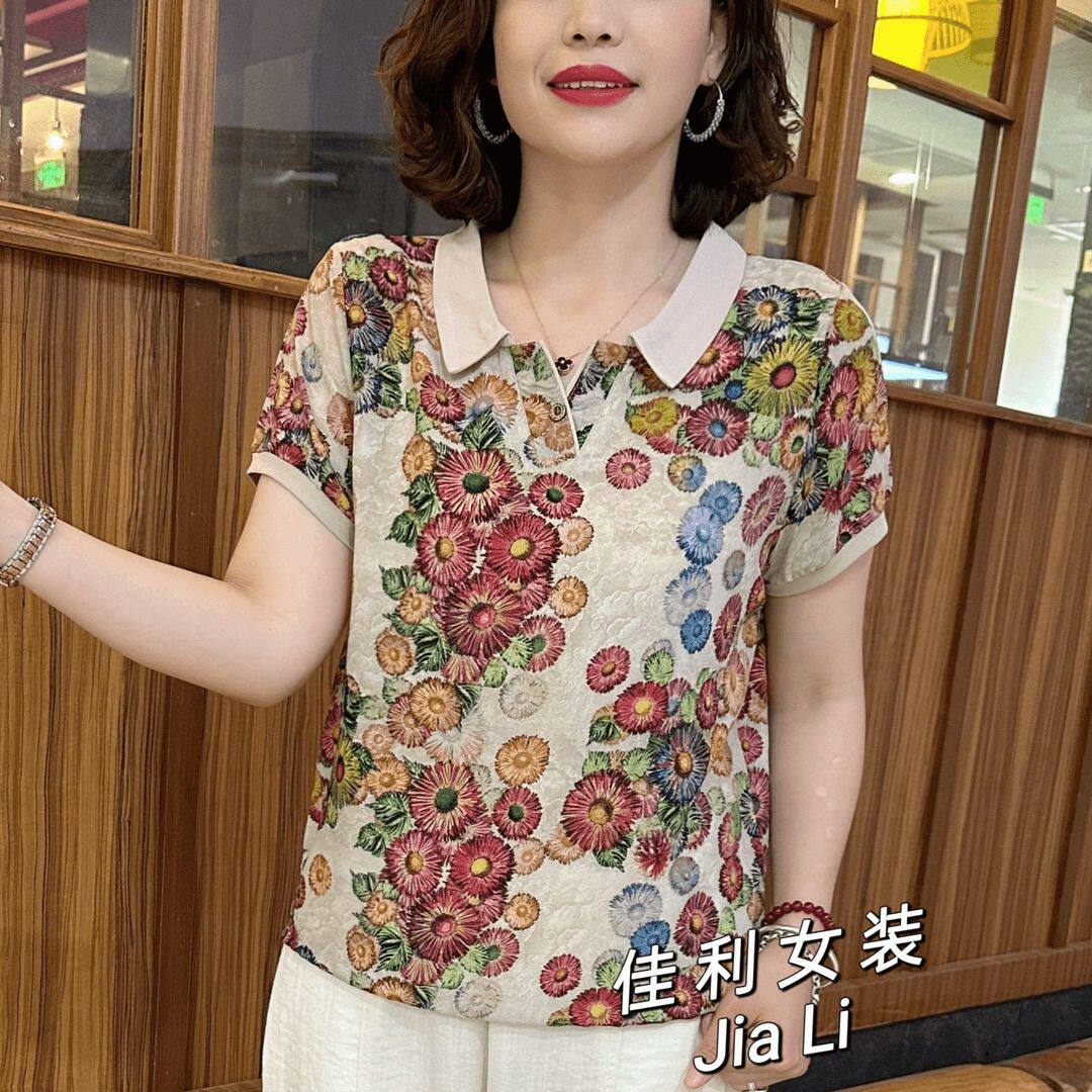 妈妈夏装翻领碎花小衫夏季新款短袖T恤女中老年宽松洋气POLO上衣