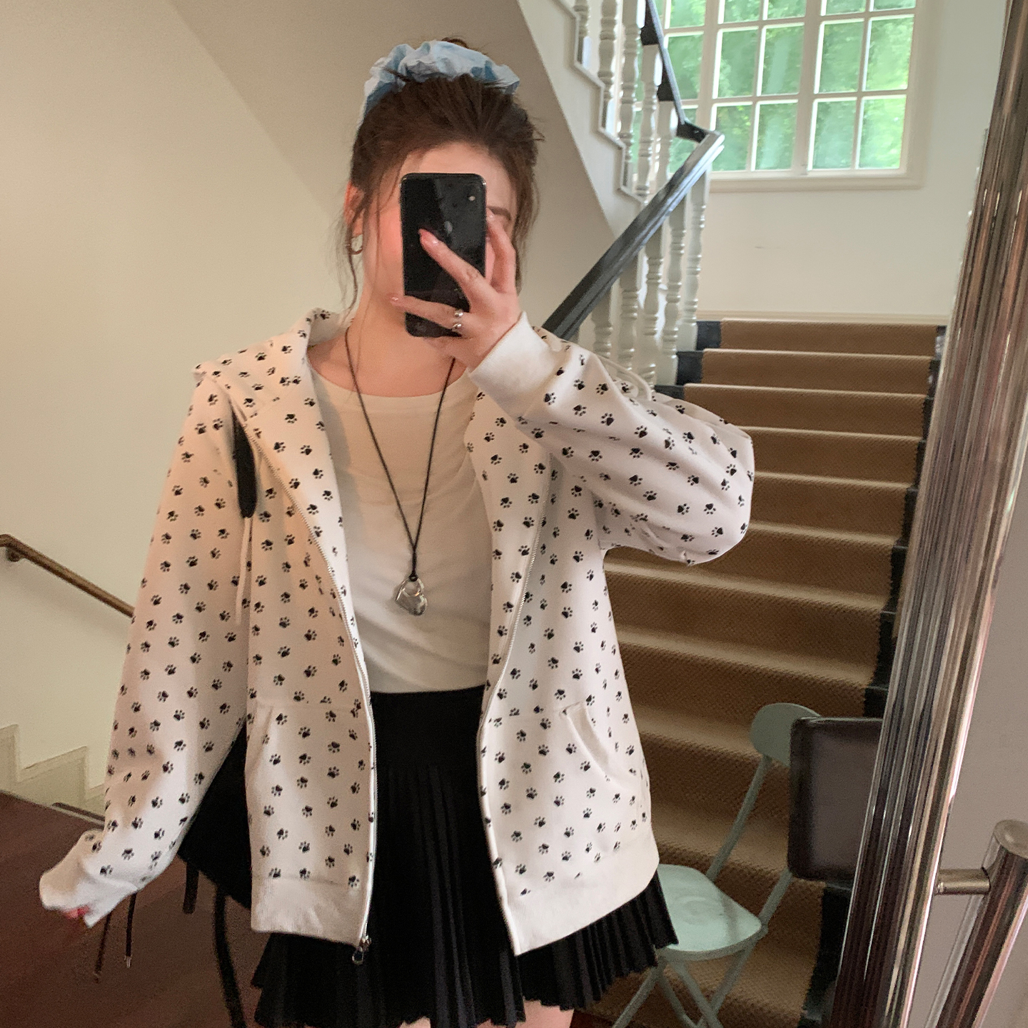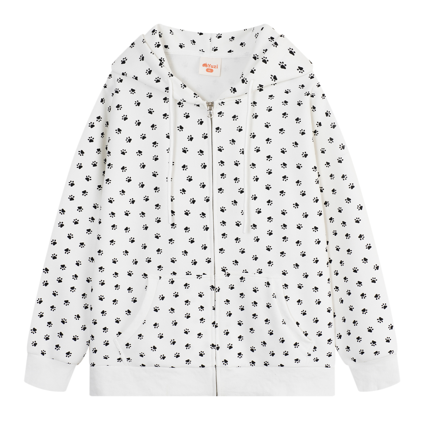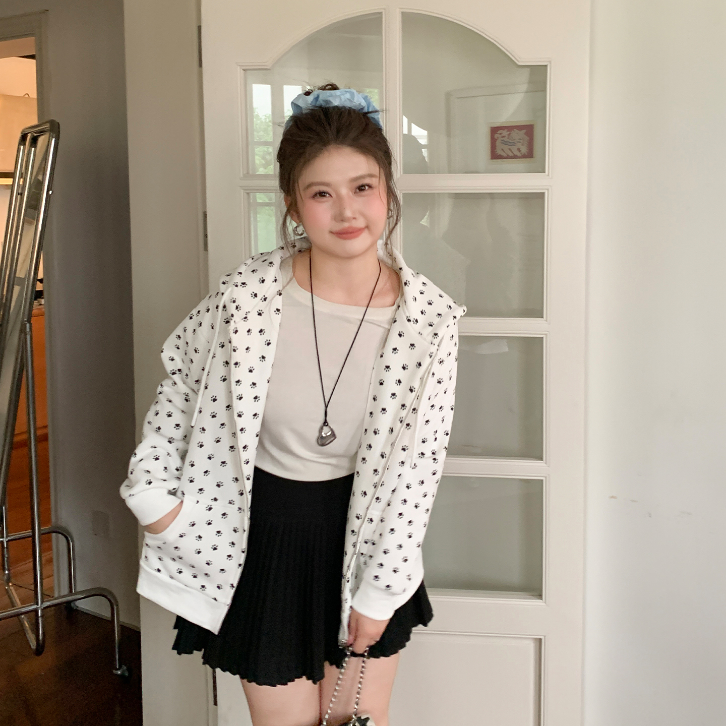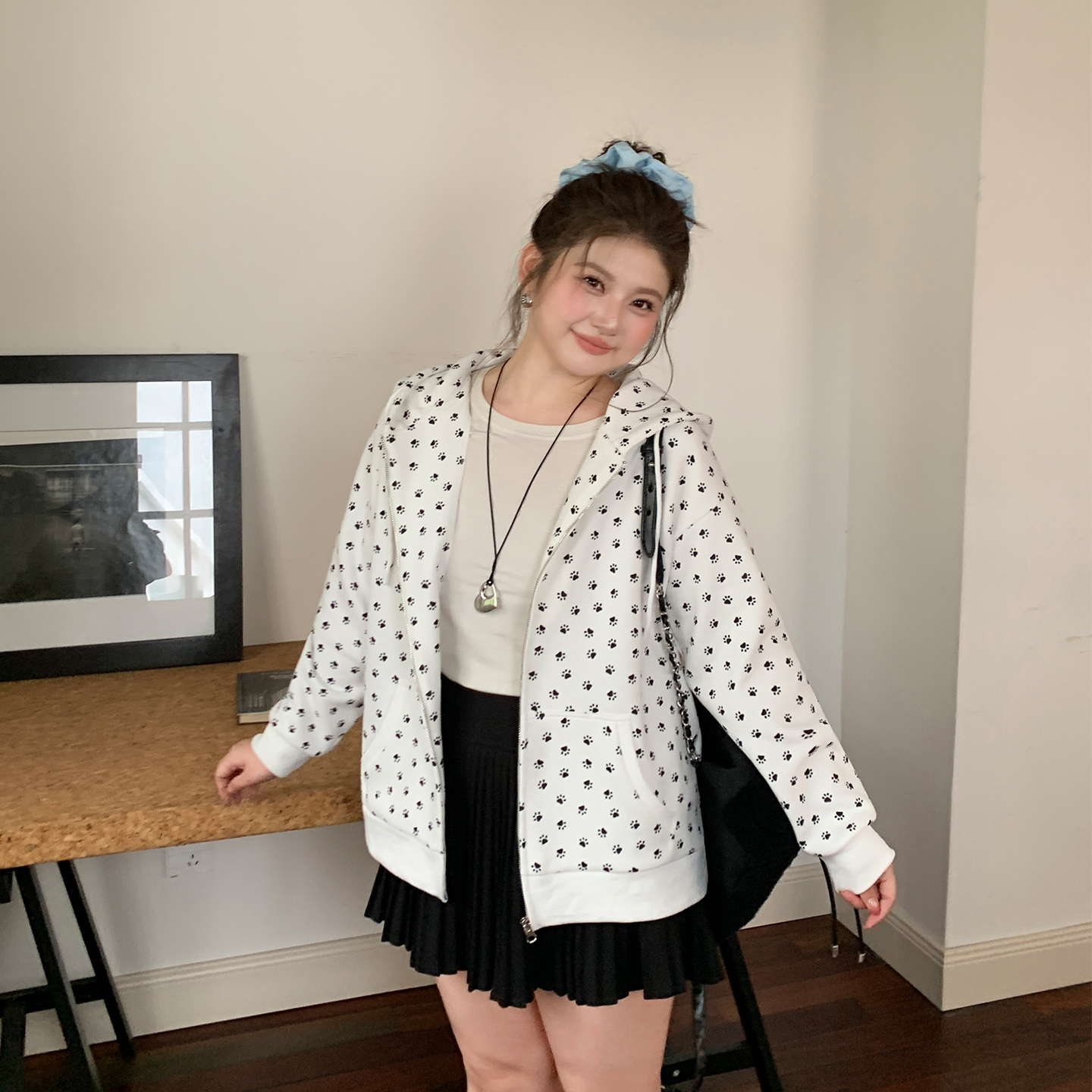 YUZI鱼子爪子印花连帽卫衣外套特大码女装胖mm宽松拉链上衣秋冬