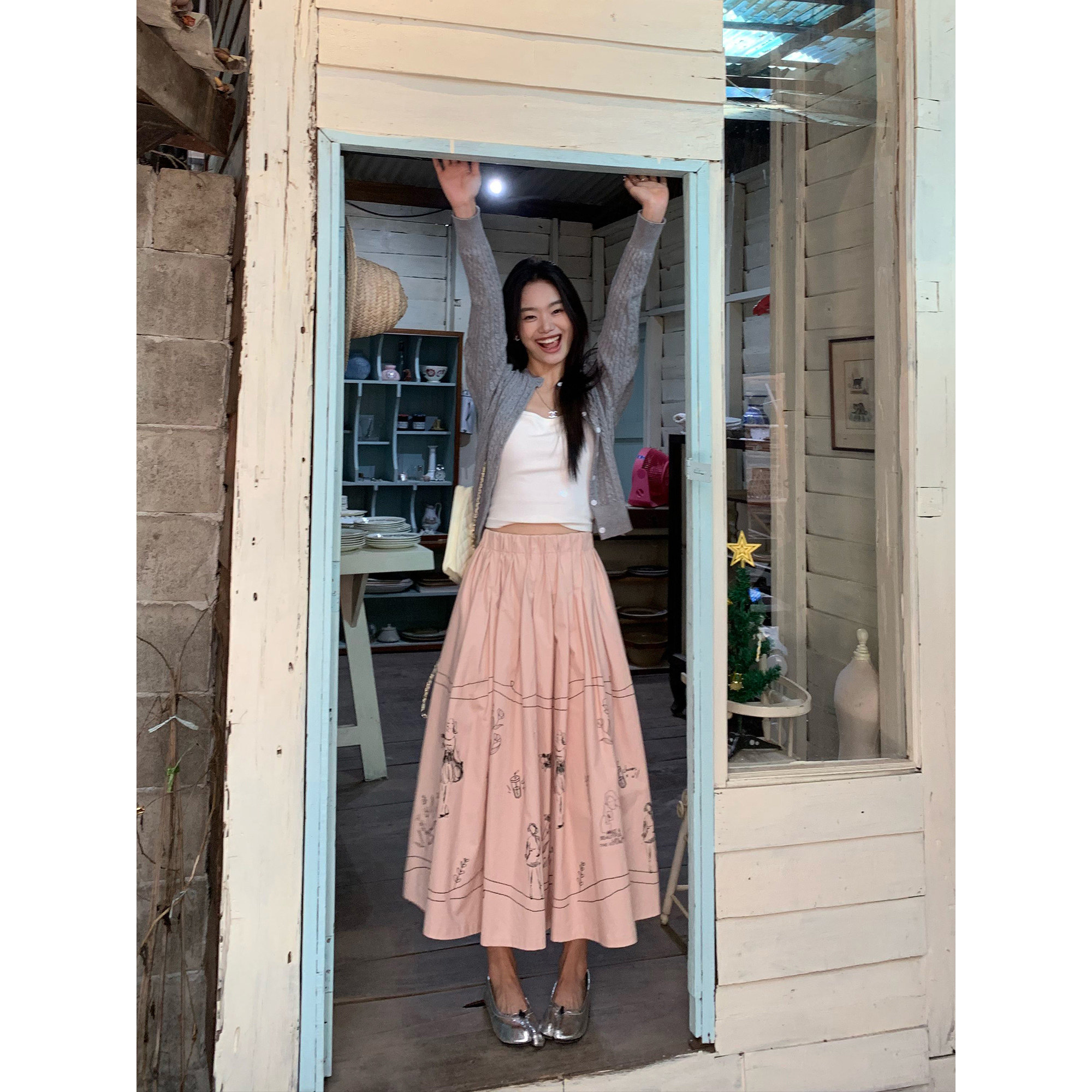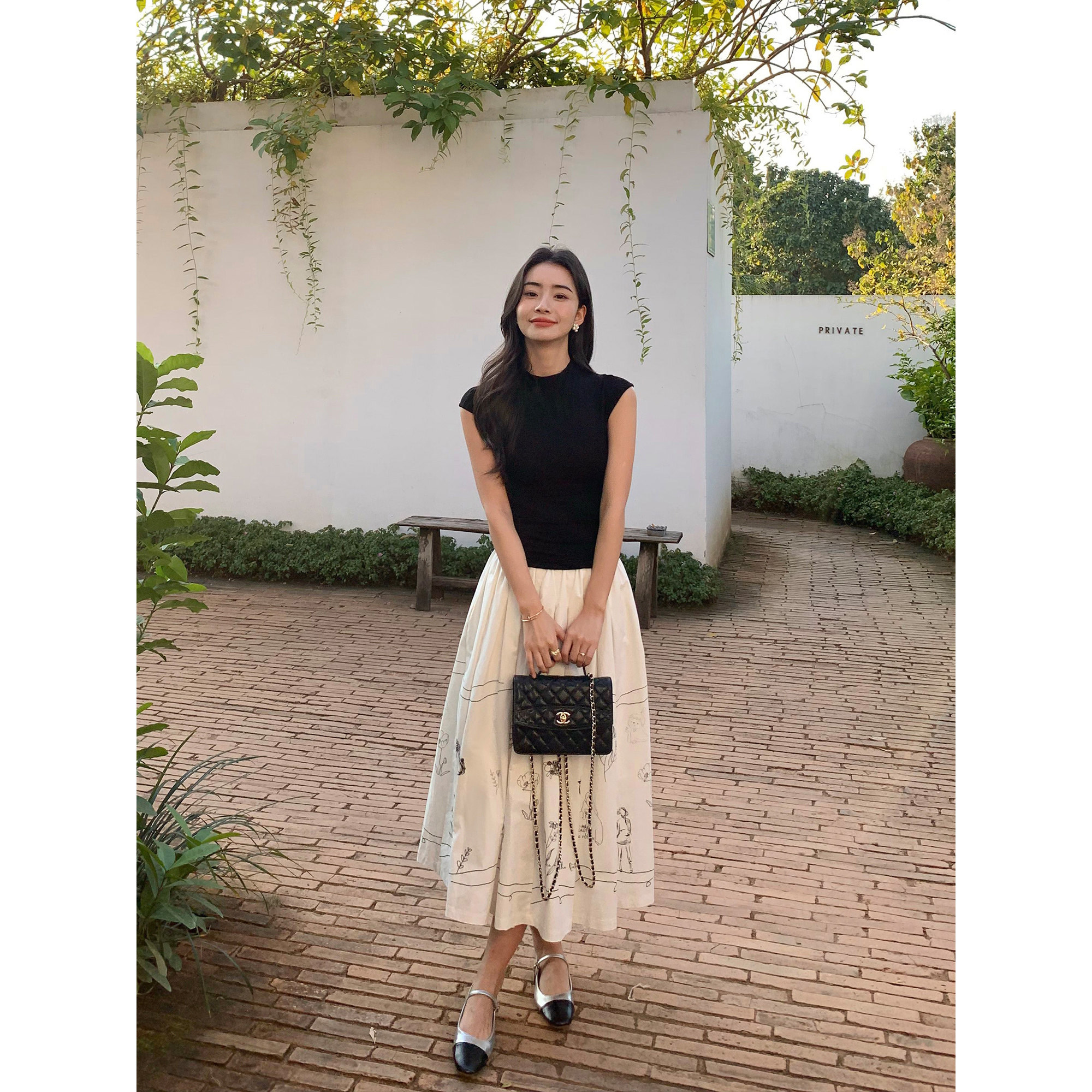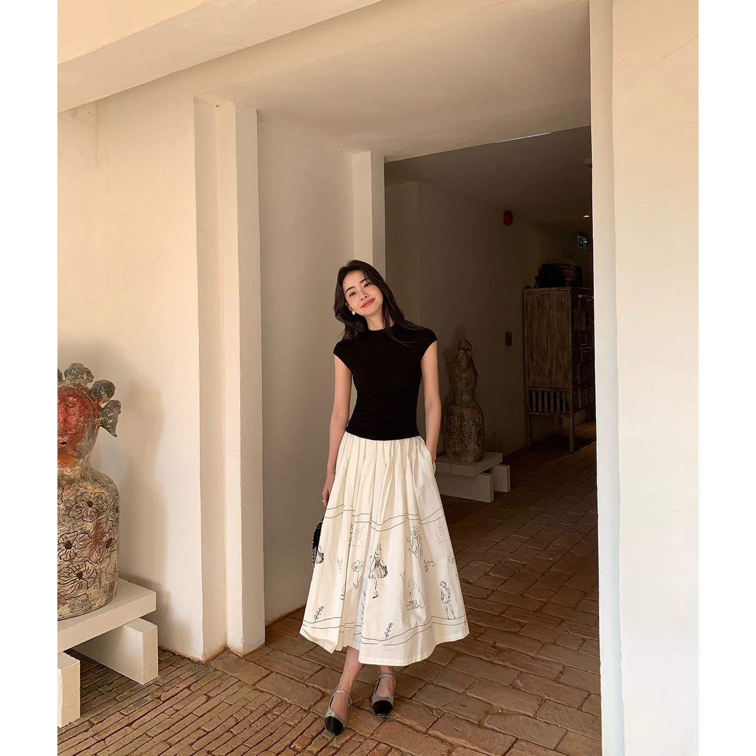 pusumede 趣味涂鸦 白色半身裙女宽松遮胯大裙摆a字伞裙小众裙子