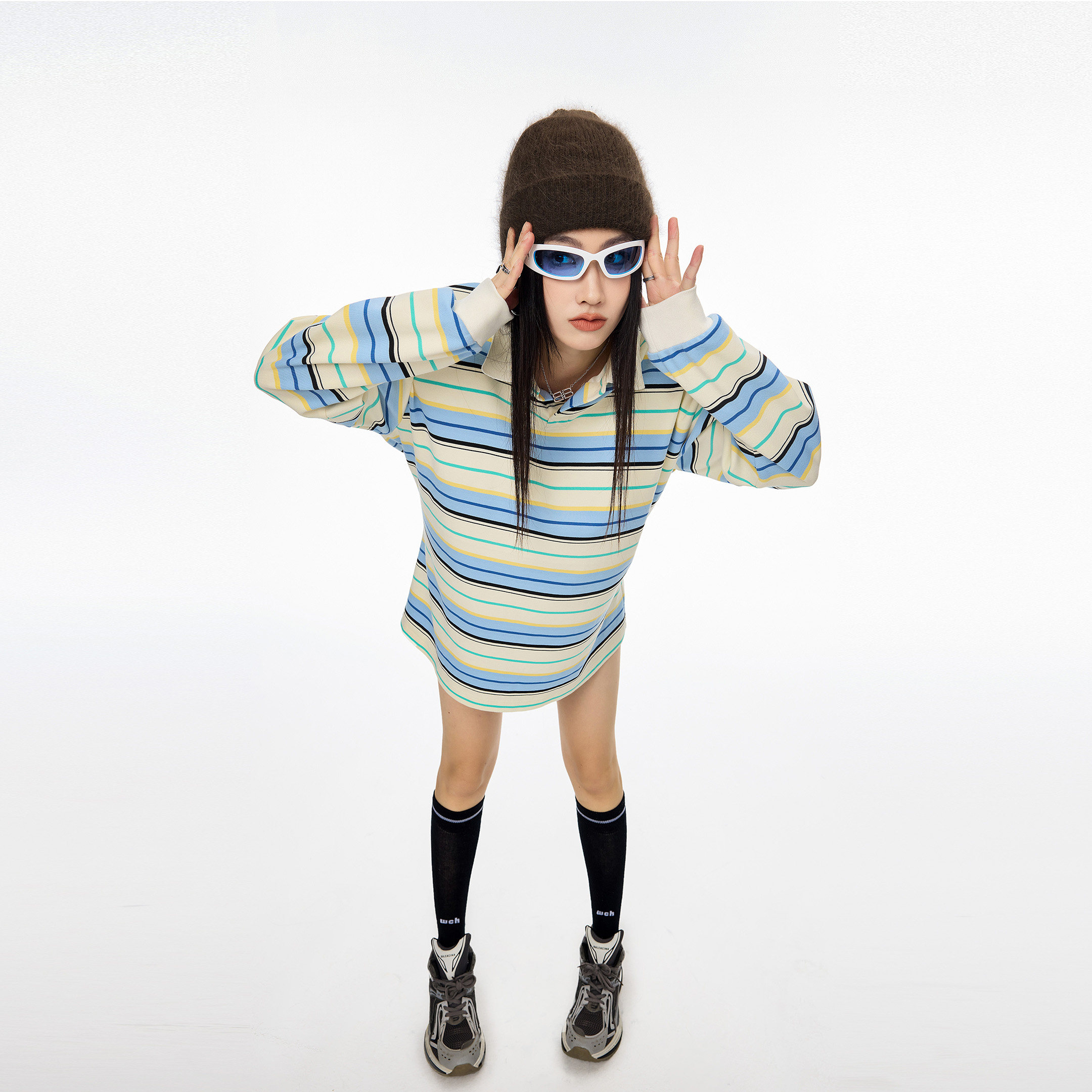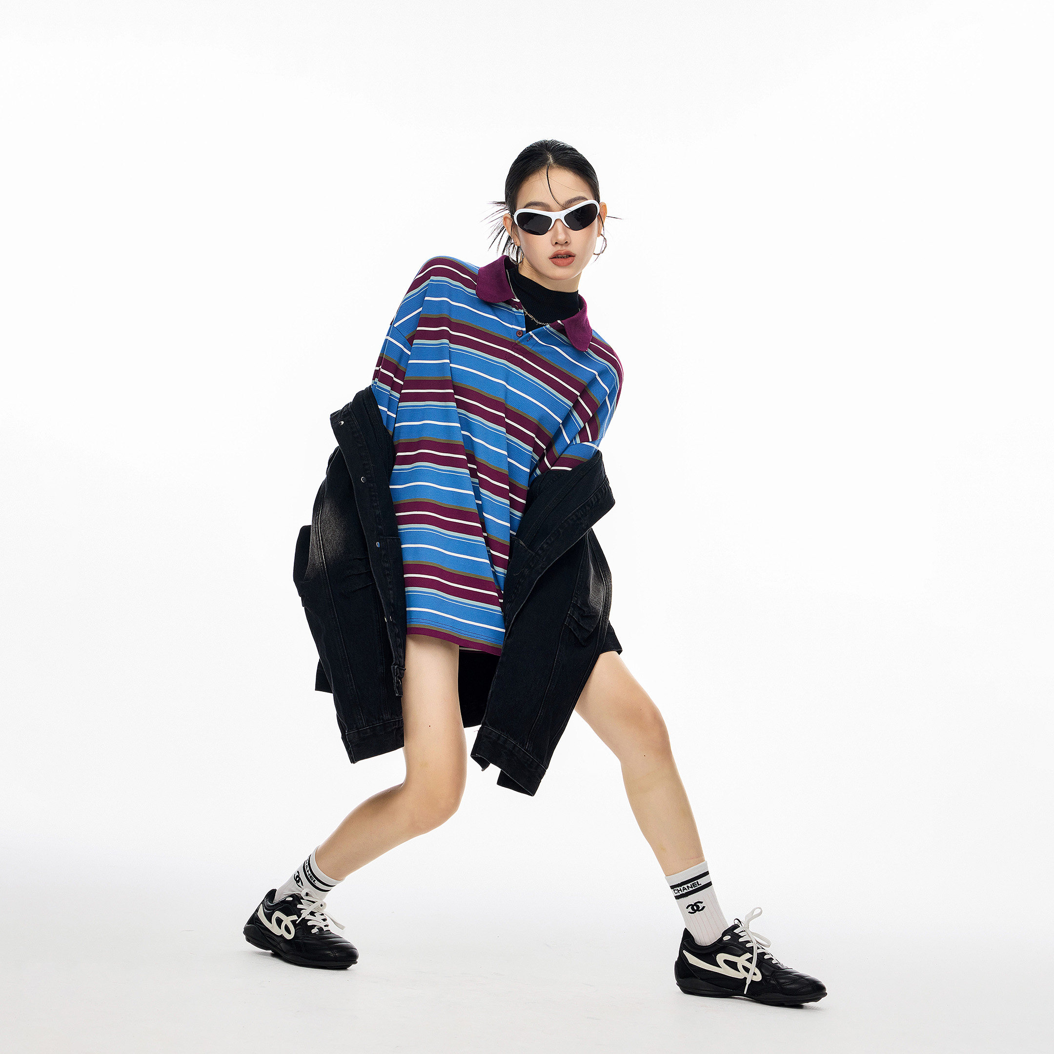 ICH MODE 美式复古条纹长袖T恤女春季新款拼接运动POLO衫休闲上衣