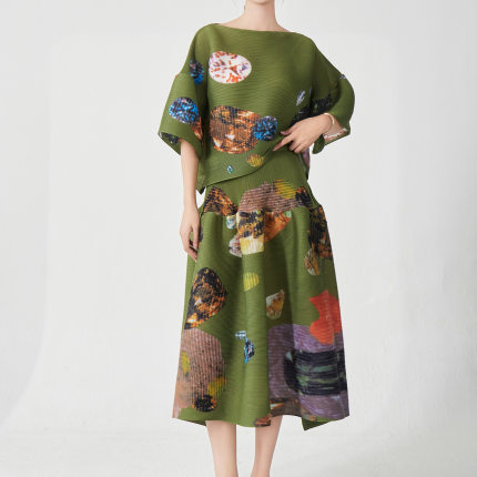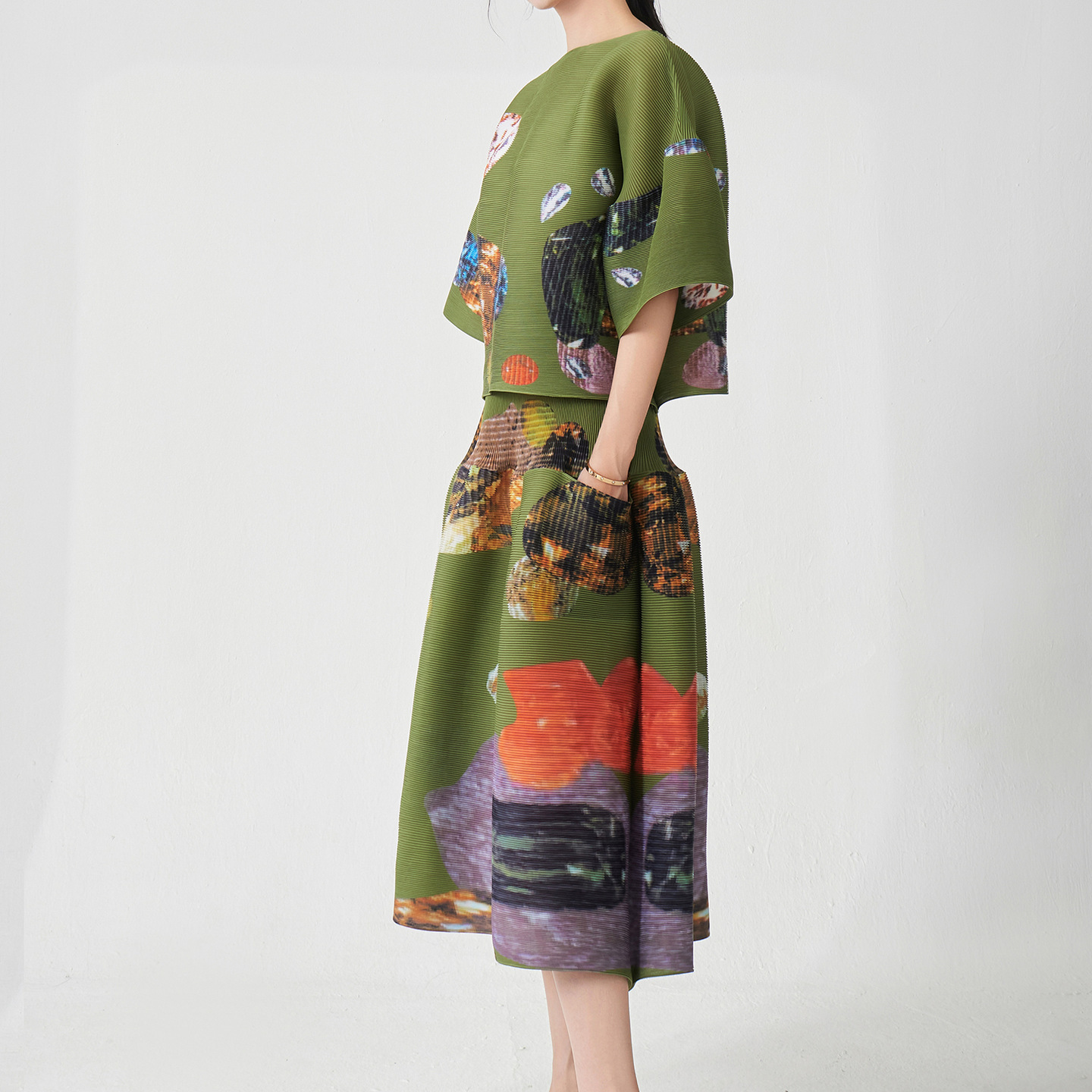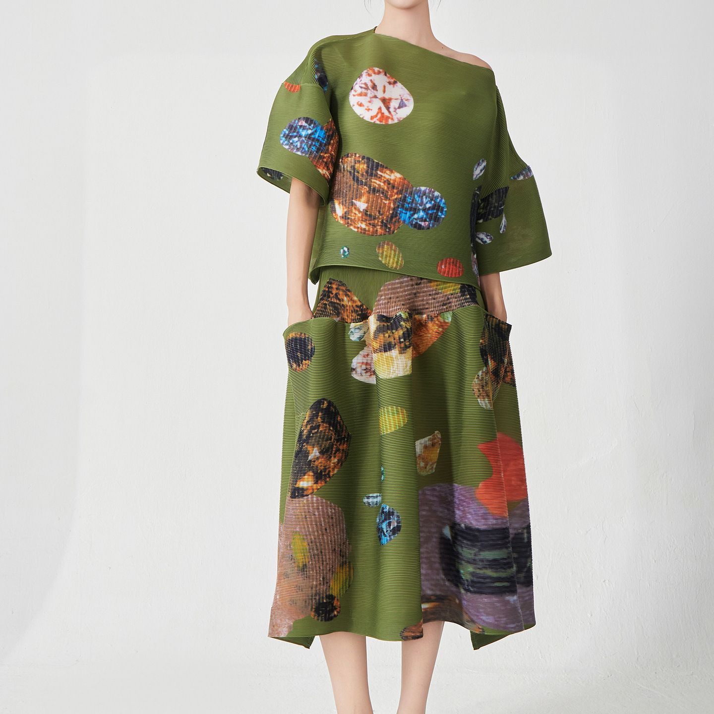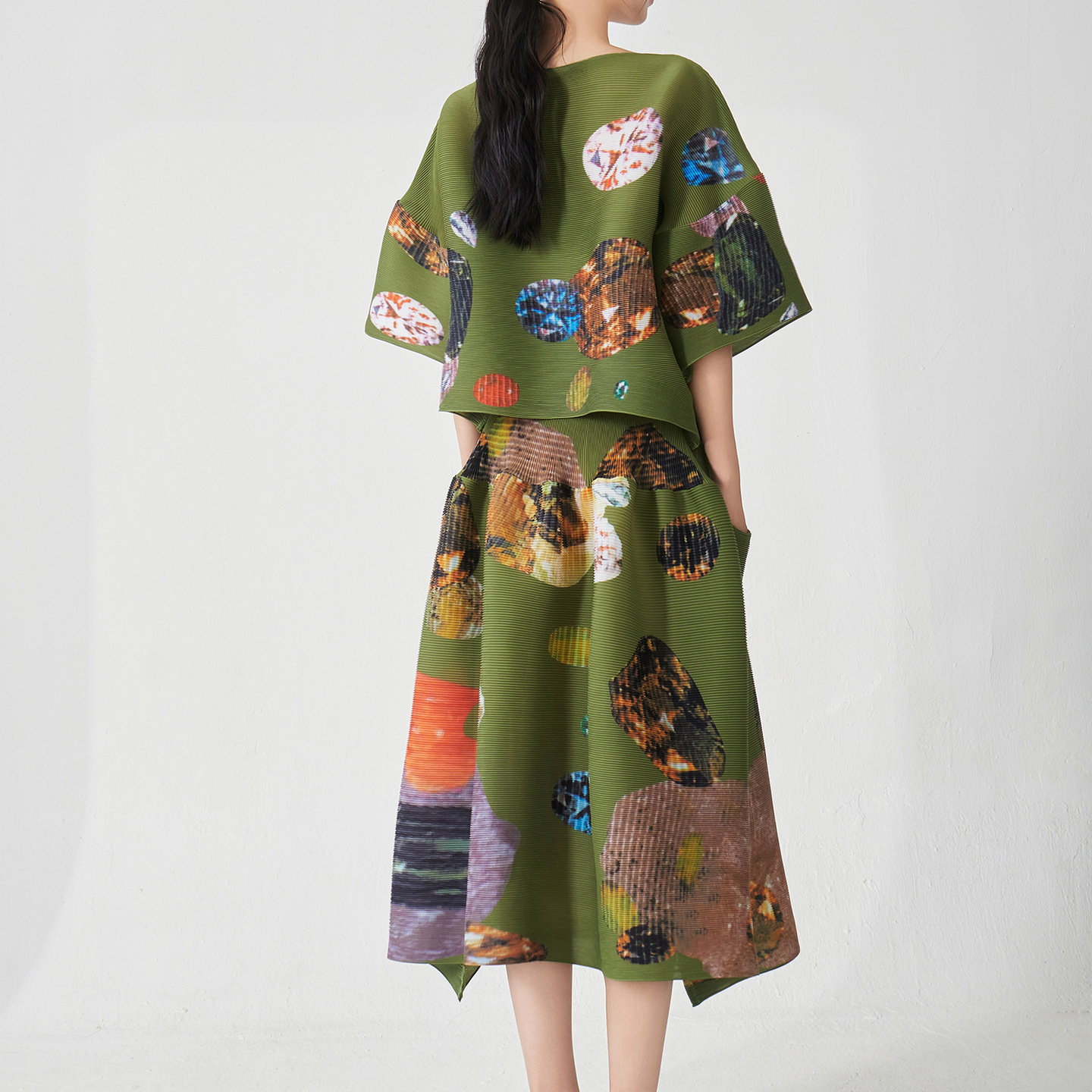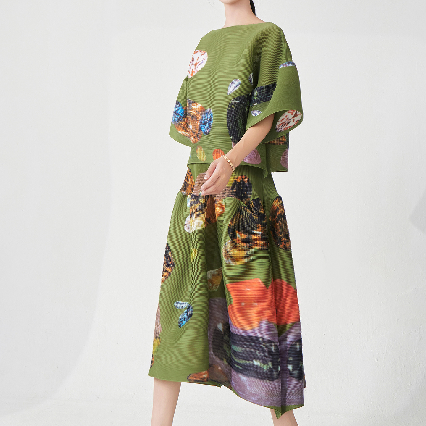 三宅时尚褶皱女两件套高级感时尚印花宽松上衣百搭半身裙女