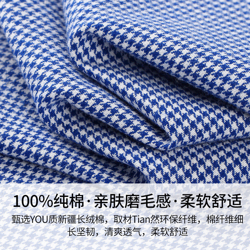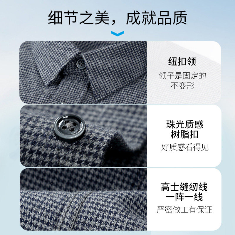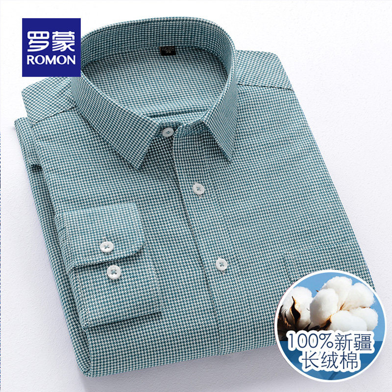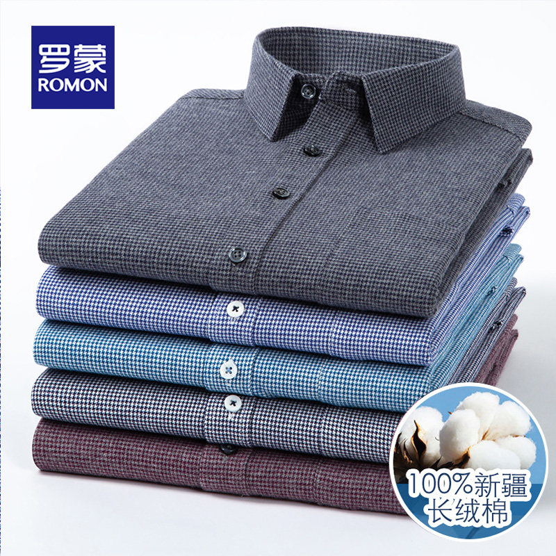 罗蒙秋冬纯棉磨毛男士长袖衬衫中年商务休闲格子衬衣100%全棉抗皱