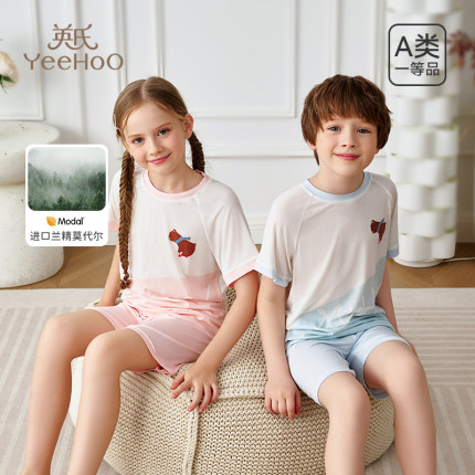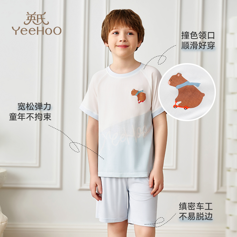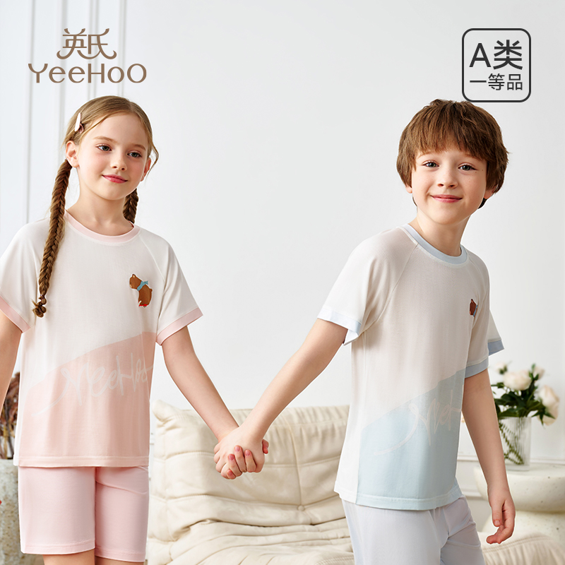 英氏莫代尔儿童家居服男童女童睡衣分体休闲短袖套装2025夏季新款